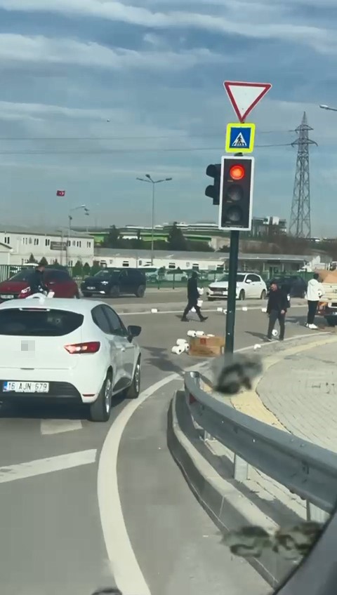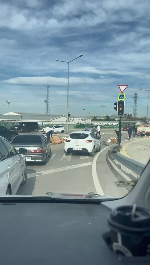Bursa’da kamyonetin kasasından yere dökülen peçeteler için sürücüler seferber olurken, o anlar cep telefon kamerasına yansıdı.