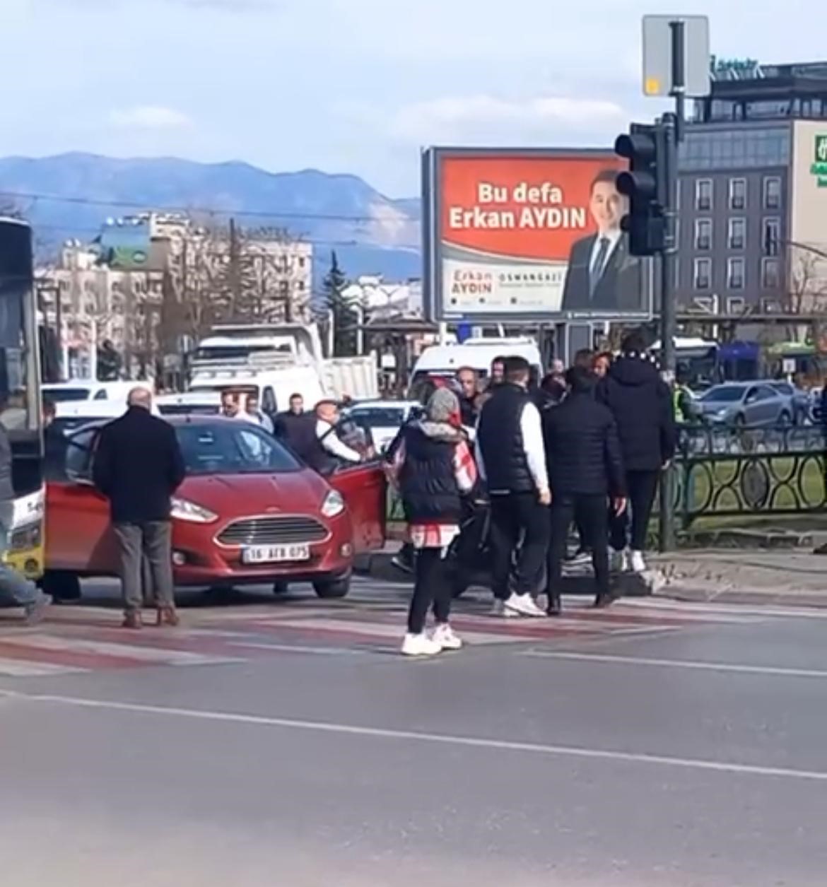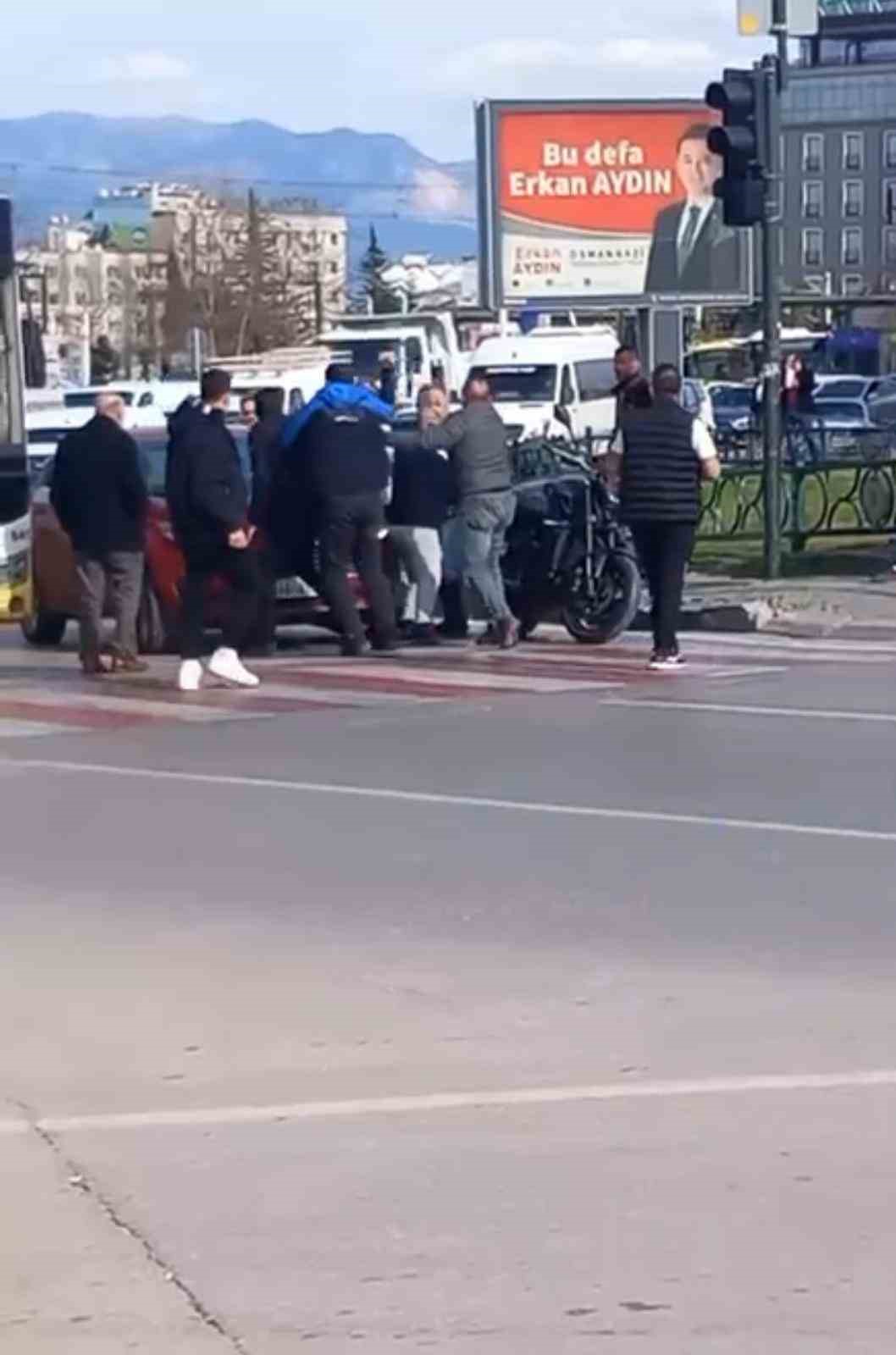 Merkez, Osmangazi ilçesi Santral Garaj Mahallesi’nde motosiklet sürücüsü ile araç sürücüsü arasında çıkan sözlü tartışma trafik ışıklarında durunca kavgaya dönüştü.