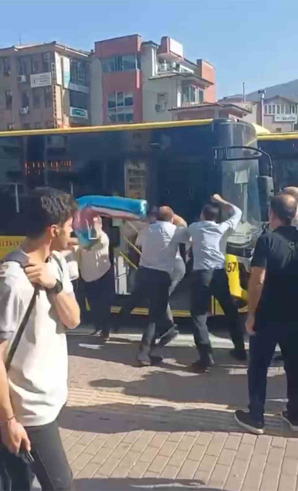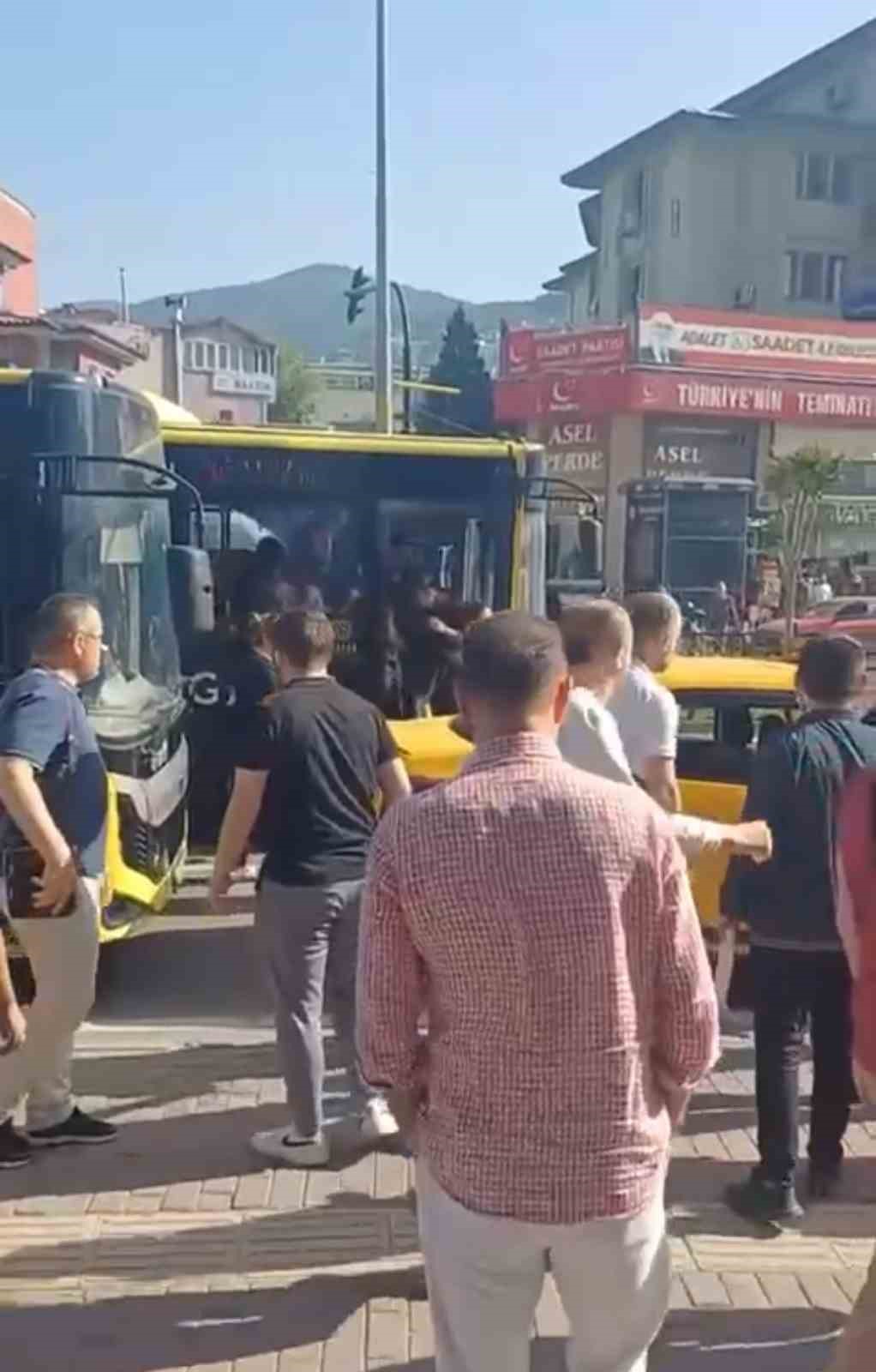Bursa’da ticari taksi ile belediye otobüsü şoförünün yol vermek kavgasında yumruklar konuştu. Birbirlerine acımasızca vuran şoförleri vatandaşlar ayırdı.