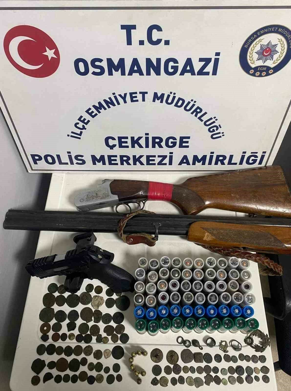 Bursa’nın Osmangazi ilçesinde tarihi eser ticareti yaptığı iddia edilen bir kişinin evinde yapılan aramada, 111 adet tarihi materyal ile ruhsatsız silah ve av tüfeği ele geçirildi.