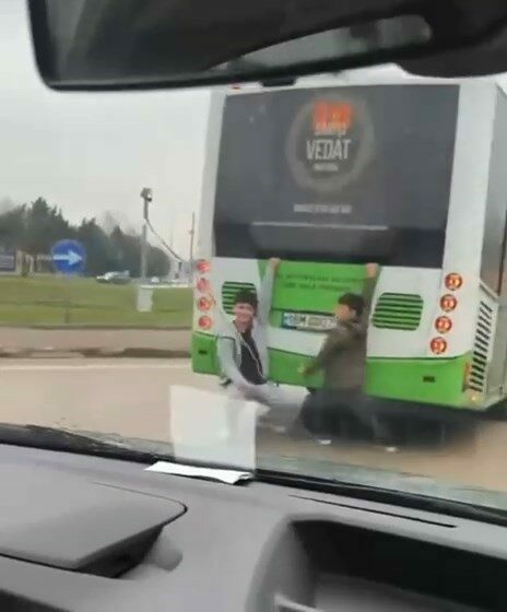 Seyir halindeki otobüsün arka bölümüne tutunarak ayaklarını yere süre çocuklar, uzun süre bu şekilde yolculuk yaptı. Tehlikeli anlar, çevredeki bir vatandaşın cep telefonu kamerasına saniye saniye yansıdı.