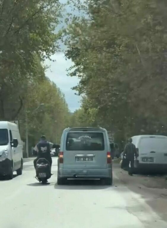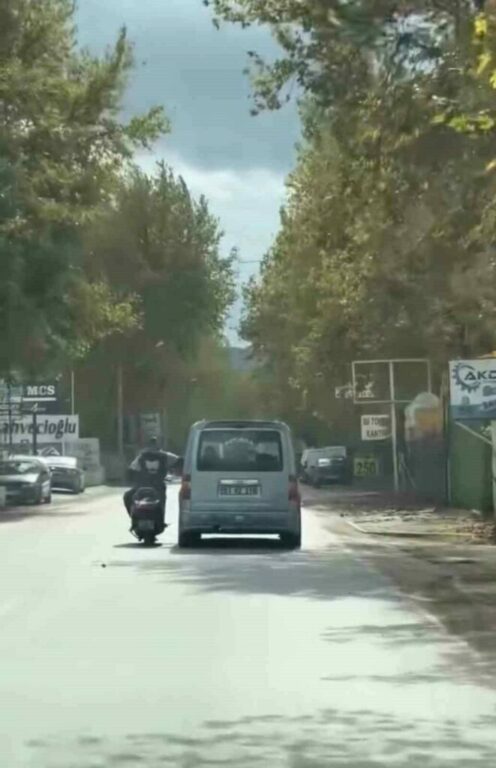 Bursa’da bir motosiklet sürücüsü seyir halindeki arkadaşıyla sohbet etmek için, bir elini seyir halindeki ticari aracın camına yasladı, diğer eliyle de motosikleti kullandı. Sürücülerin tehlikeli hareketleri kameralara yansıdı.