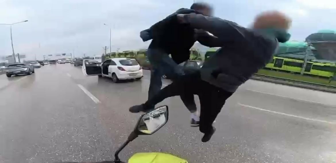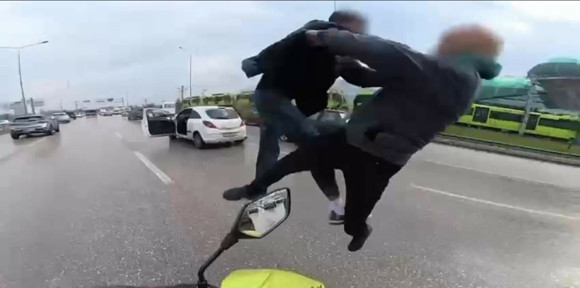 Bursa-İzmir yolu üzerinde ‘yol verme’ meselesi nedeniyle iki sürücü arasında tartışma çıktı. Araçlarından inen taraflar birbirlerine uçan tekmeyle saldırdı. Korku dolu anlar kameraya yansırken, tarafları yoldan geçen kurye ve çevredeki sürücüler ayırdı. Görüntüler üzerine harekete geçen Bursa İl Emniyet Müdürlüğü ekipleri, kavga eden sürücülerin kimliklerini tespit etmek için çalışma başlattı.