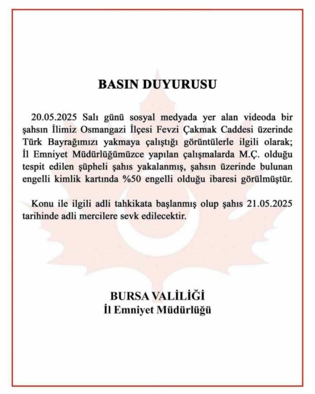 Olay sonra Bursa Valiliği yaptığı açıklamada, “20.05.2025 Salı günü sosyal medyada yer alan videoda bir şahsın ilimiz Osmangazi ilçesi Fevzi Çakmak Caddesi üzerinde Türk bayrağımızı yakmaya çalıştığı görüntülerle ilgili olarak; İl Emniyet Müdürlüğümüzce yapılan çalışmalarda M.Ç. olduğu tespit edilen şüpheli şahıs yakalanmış, şahsın üzerinde bulunan engelli kimlik kartında yüzde 50 engelli olduğu ibaresi görülmüştür. Konu ile ilgili adli tahkikata başlanmış olup, şahıs 21.05.2025 tarihinde adli mercilere sevk edilecektir” ifadelerine yer verdi.