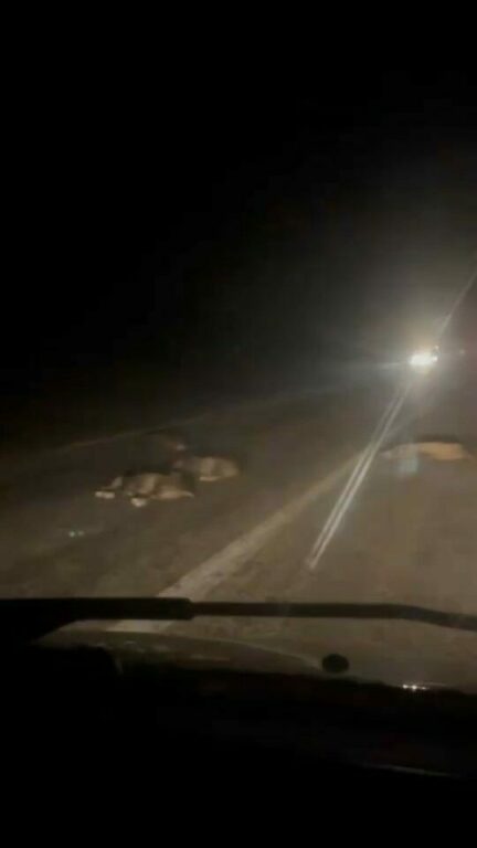Bursa’da Orhaneli Yolu üzerinde gece saatlerinde seyreden bir araç, yola aniden atlayan domuz sürüsüne çarptı. Kaza sonucu 3 yavru yabani domuz telef oldu. Telef olan domuzları başka bir araç sürücüsü görüntüledi.
