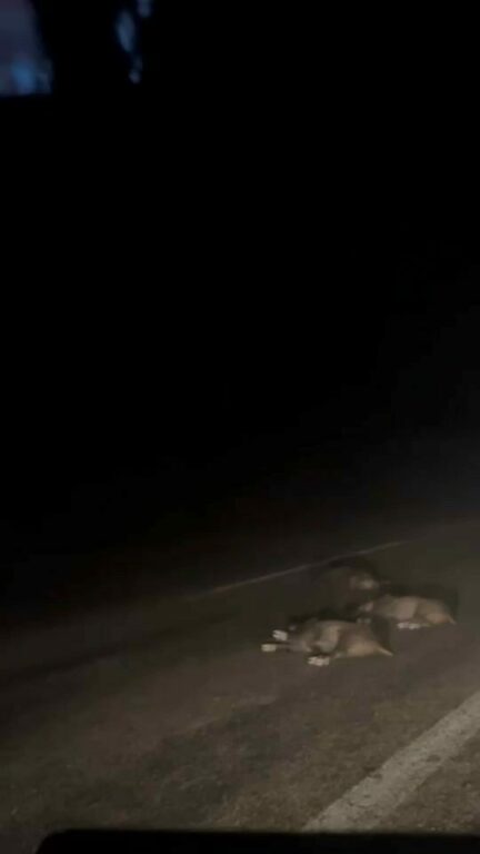 Bursa’da Orhaneli Yolu üzerinde gece saatlerinde seyreden bir araç, yola aniden atlayan domuz sürüsüne çarptı. Kaza sonucu 3 yavru yabani domuz telef oldu. Telef olan domuzları başka bir araç sürücüsü görüntüledi.