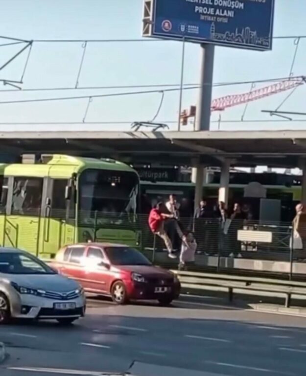 Bursa’da önce metro raylarına daha sonra koruma tellerinin üzerinde atlayarak yolun karşısına geçmeye çalışan şahıs, yürekleri ağza getirdi. Metro seferlerinin de kısa süreli aksamasına neden olan şahıs bölgeden uzaklaştı.