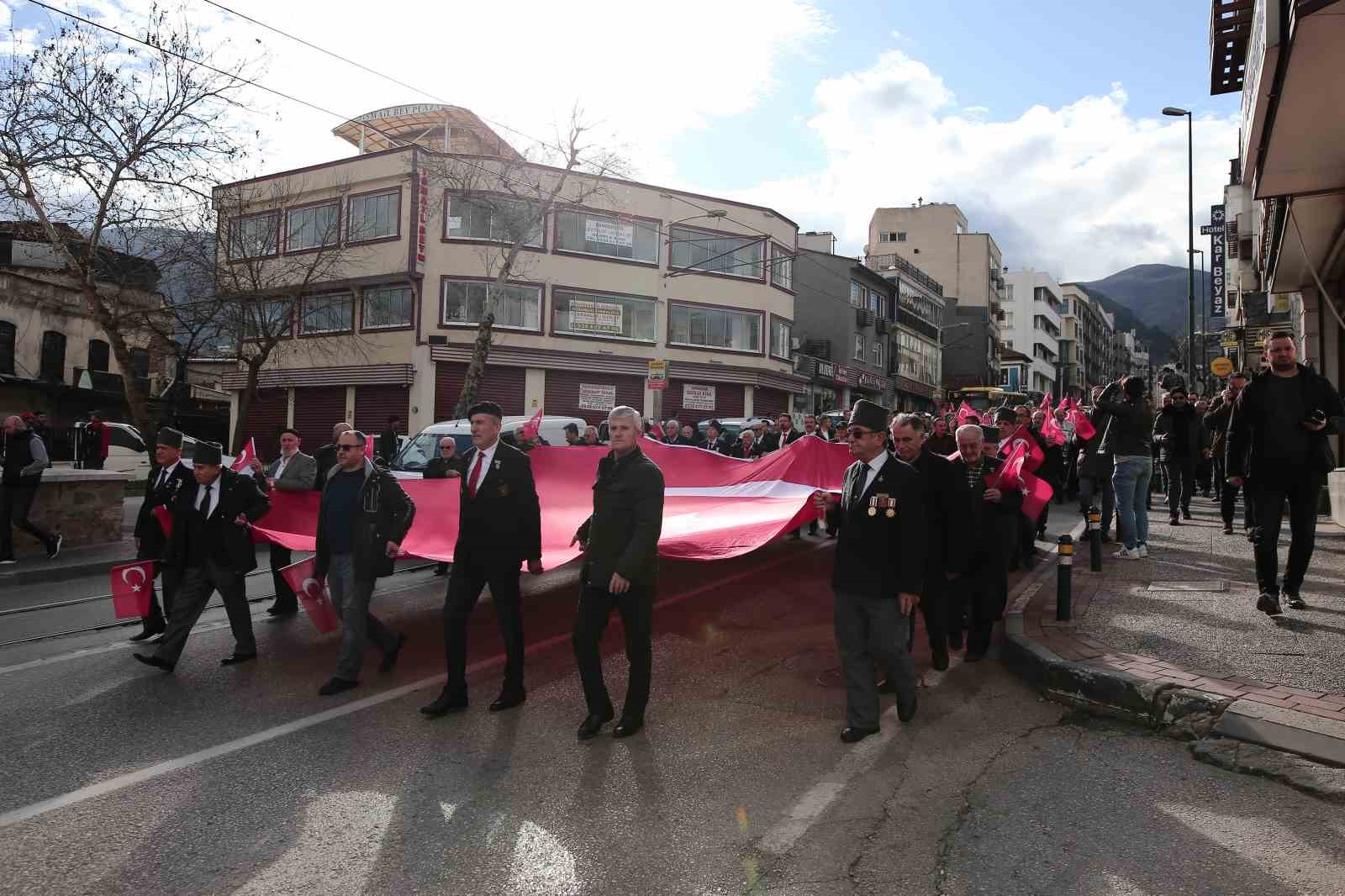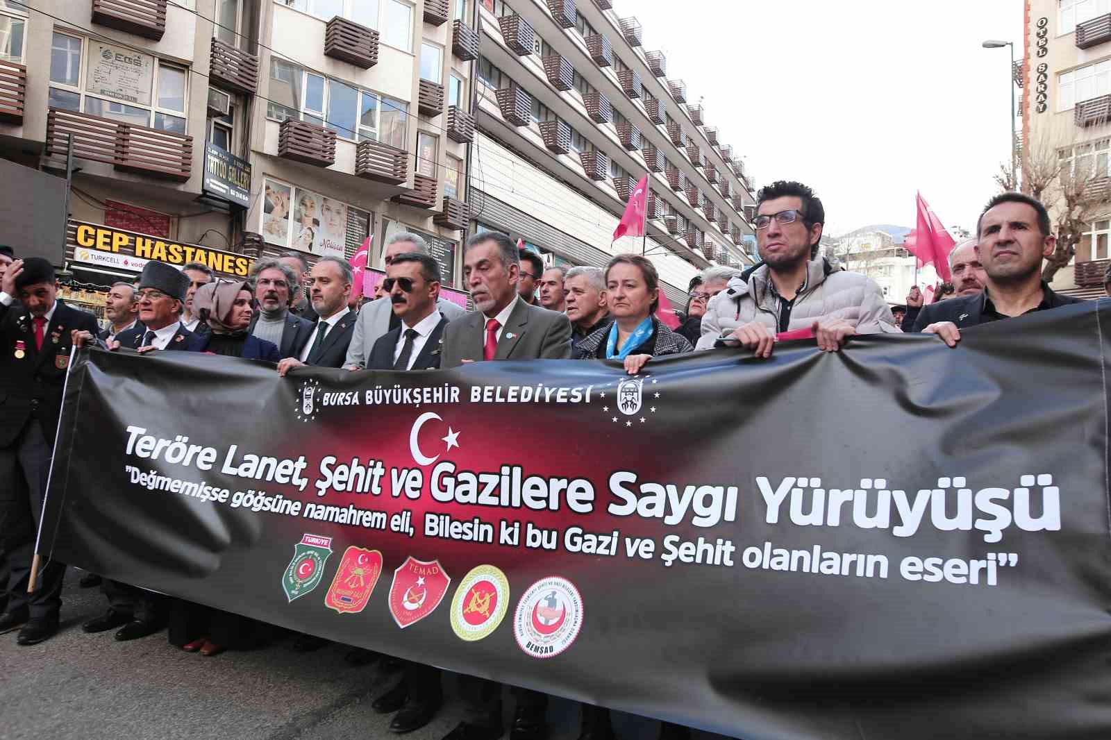 Bursa Büyükşehir Belediyesi, Şehit ve Gaziler Derneği ile birlikte ’Teröre Lanet Şehitlerimize ve Gazilerimize Saygı Yürüyüşü’ gerçekleştirildi. Yüzlerce kişi, şehitlerin fotoğrafları ve Türk bayrakları ile şehrin merkezinde teröre lanet okudu.