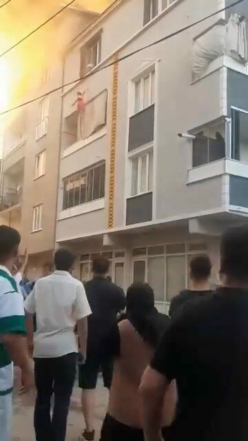 Bursa’nın Gürsu ilçesinde 3 katlı binanın çatı katının alevlere teslim olduğu anlarda babaanne ve torunu vatandaşların gerdiği battaniyenin üzerine atlayarak kurtuldu. O anların görüntüsü ortaya çıktı. Babaanne ilk önce torunun aşağı bıraktı, sonra kendi atladı. Kurtulmalarının ardından vatandaşlar alkışlarla büyük bir sevinç yaşadı. Olayı anlatan oğlu Ferhat Gökçe, “Annem ve yeğenim kendi imkanlarıyla inmeye çalıştı. Başaramayınca camdan atlamak zorunda kaldılar. Çok şükür iyiler ama vücutlarında kırıklar var. Cana geleceğine mala gelsin” dedi.