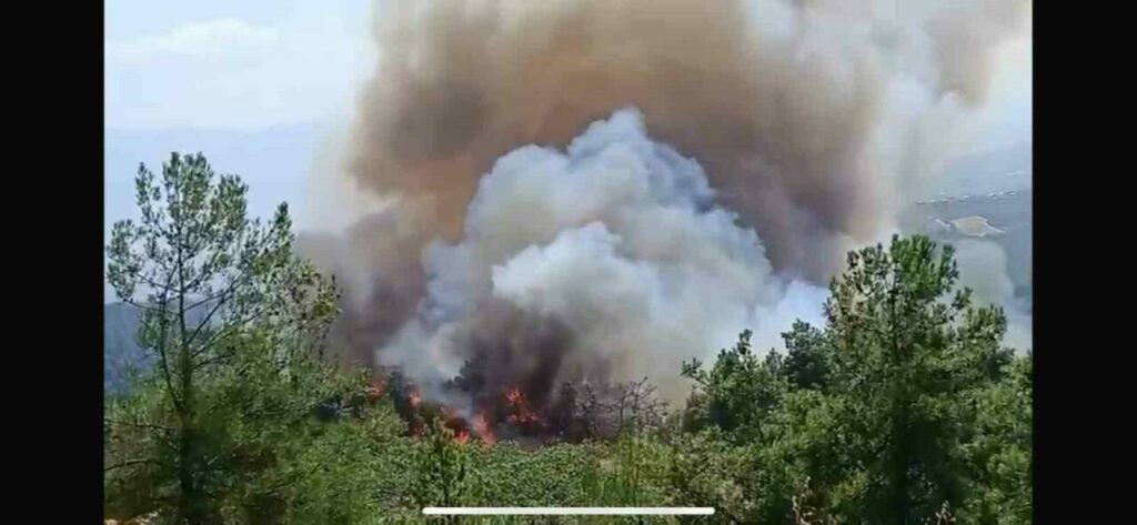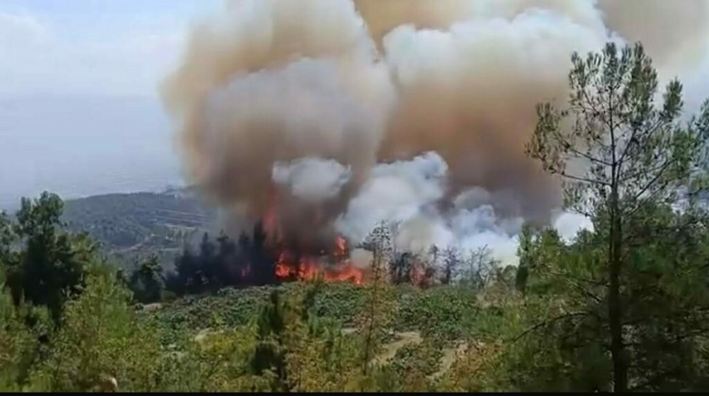 Öğle saatlerinde televizyon vericilerinin bulunduğu Gündoğdu köyündeki çamlık alanda çıkan yangın zeytin bahçelerine ve ekili alanlara da sıçradı. Yangın daha sonra alt taraftaki Çağlayan köyüne doğru büyüdü. Bölgede birkaç noktada yangının sürdüğü öğrenilirken, alevlere hem havadan hem karadan müdahale ediliyor.