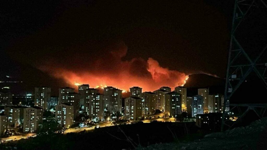 Vadide kalan köy, tepedeki alevlerin tehdidi altında. Geceyi kızıla boyayan yangına karşı ekiplerin ve vatandaşların mücadelesi sürüyor. Yükselen alevler dron ile havadan görüntülendi.