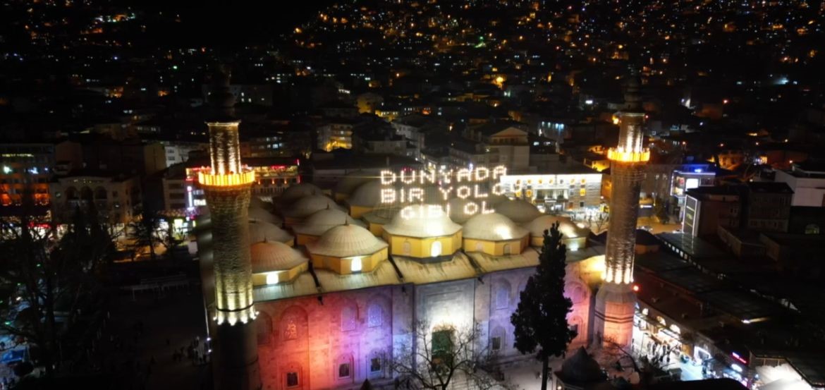 Osmanlı Devleti’nde ilk defa Sultanahmet Camii’ne asılmasıyla başlayan 400 yıllık mahya geleneği devam ediyor. Bursa’daki tarihi Ulu Camii’nin minareleri arasına “Dünyada bir yolcu gibi ol” yazılı mahya asılırken, iki minare arasını süsleyen yazı, dron ile görüntülendi.