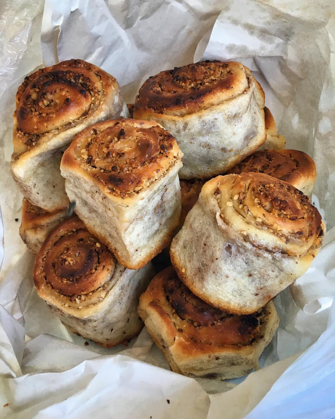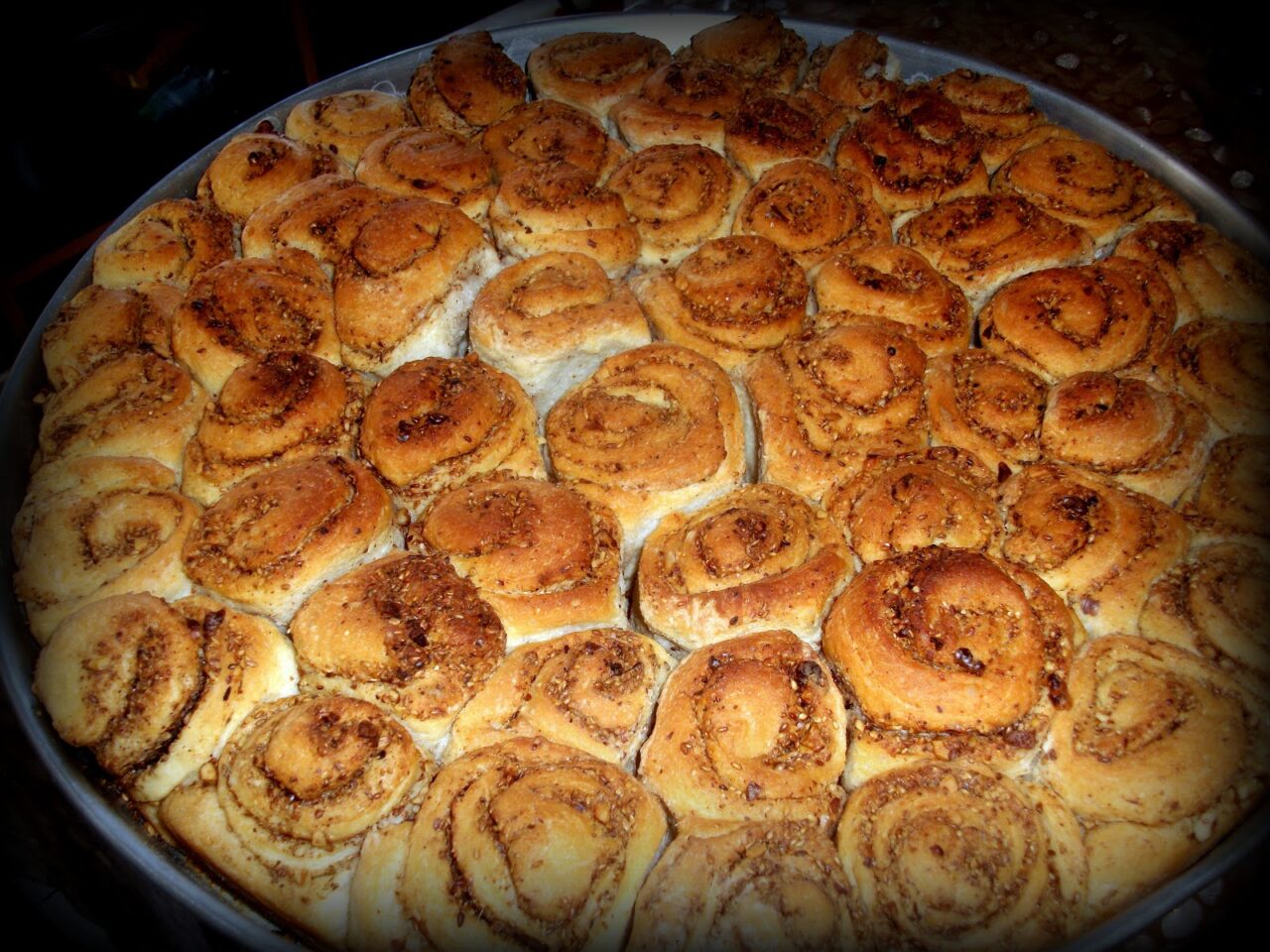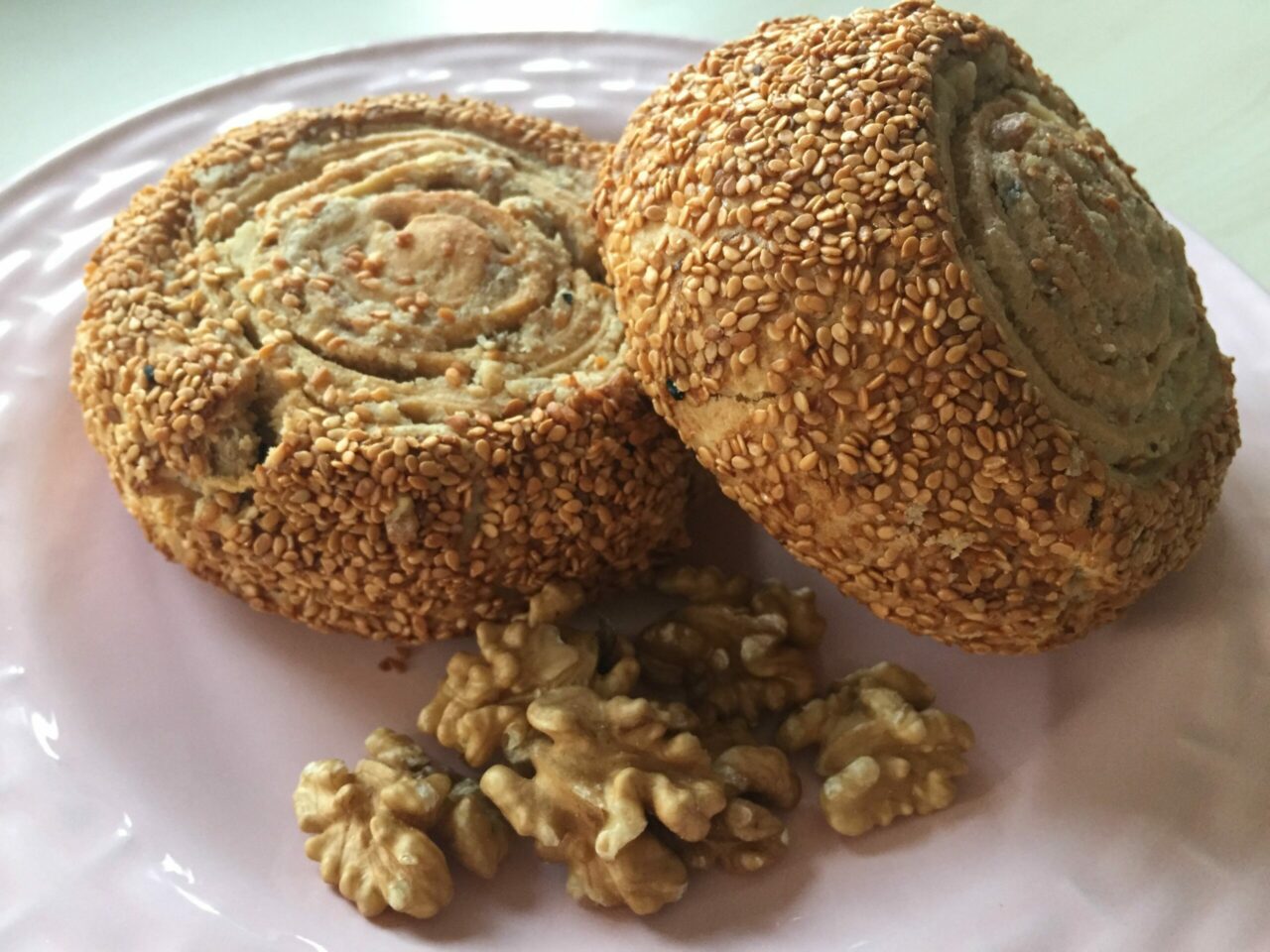 Açtığınız hamurun üzerine cevizli harcın üçte birini yayın ve rulo yapın. Ruloyu eşit parçalar halinde kesin. Diğer iki beze için de aynı işlemi uygulayıp yağlı kağıt serili bir fırın tepisine dizin.