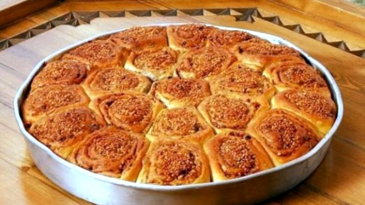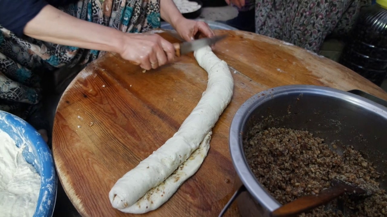 Hamurun üzerini nemli bir bezle örterek 30 dakika dinlendirin. İç harcı için ceviz, baharatlar ve şekeri cevizleri çok fazla ufalamadan blenderdan geçirin.