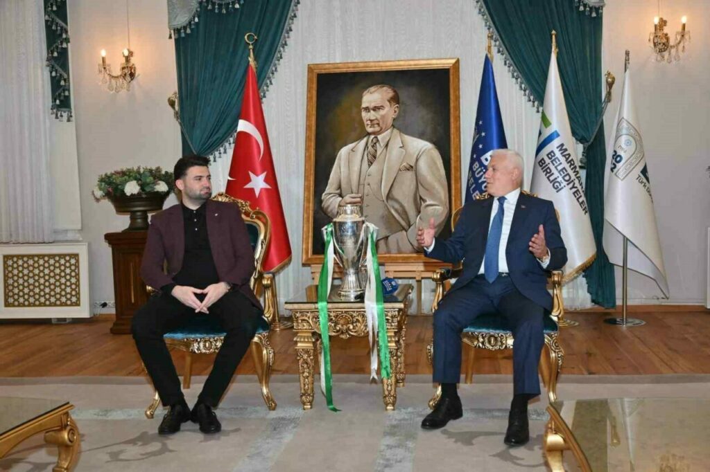Nesine 3. Lig 1. Grup’ta şampiyonluğa ulaşarak 2. Lig’e yükselmeye hak kazanan Bursaspor’un Başkanı Enes Çelik ve yönetim kurulu üyeleri, şampiyonluk kupasıyla birlikte Bursa Büyükşehir Belediye Başkanı Mustafa Bozbey’i Tarihi Belediye Binası’nda ziyaret eti. Samimi bir ortamda gerçekleşen ziyarette, zorlu bir süreçten geçerek bir üst lige çıkmayı başaran Bursaspor’un yeni hedefleri konuşuldu.