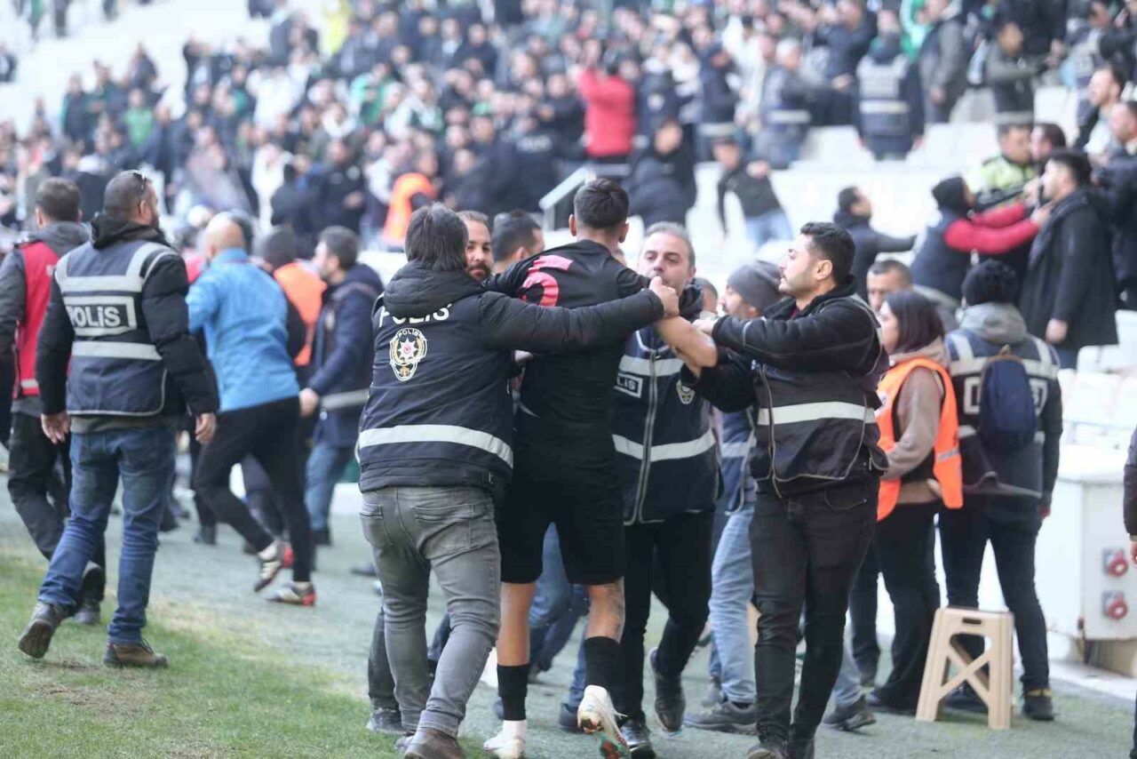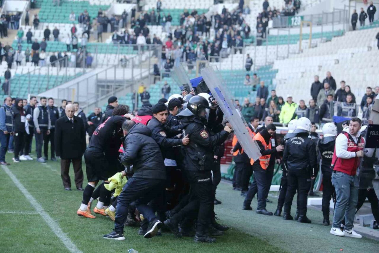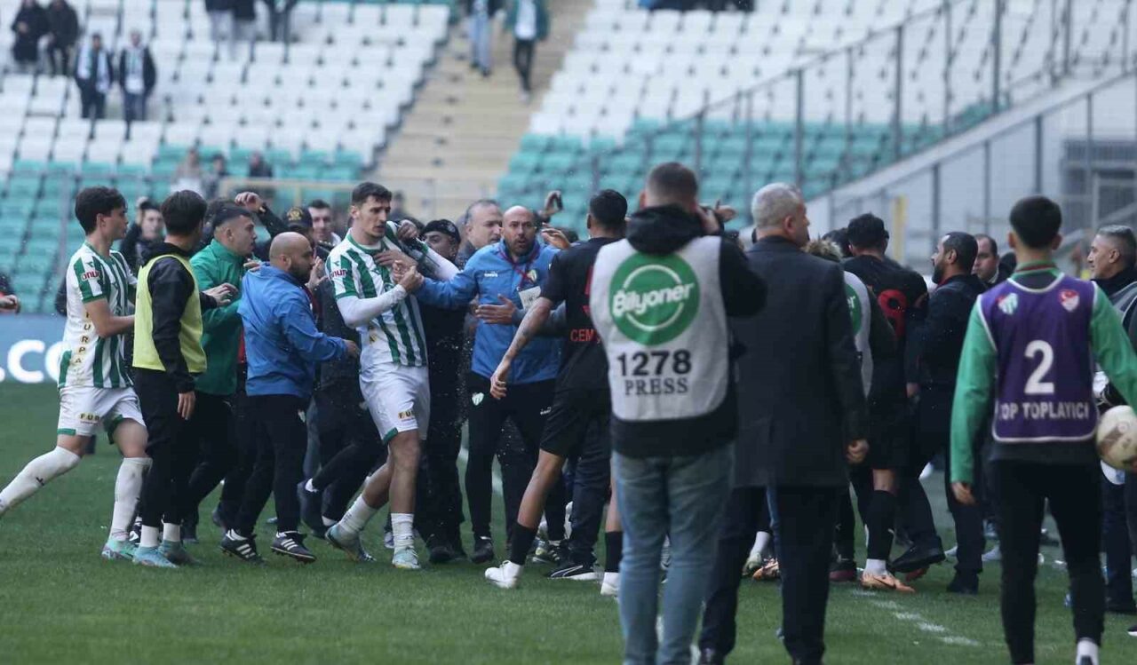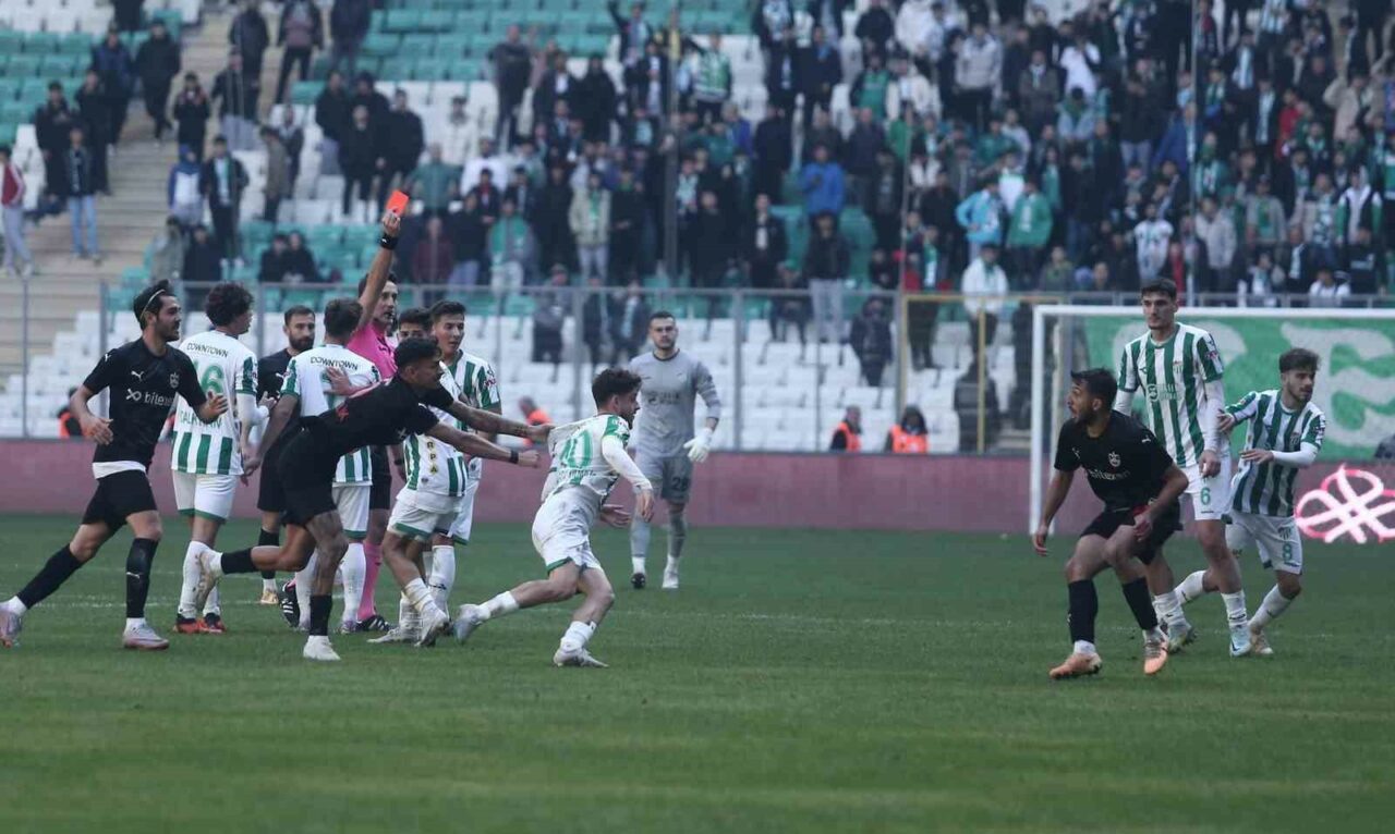 Hakem Burak Taşkınsoy, Çağatay Yılmaz’a kırmızı kart gösterince futbolcular arasında arbede çıktı. Olaylar sonrasında Diyarbekirspor’dan Serhat Çalışkan, Cem Celik ve Bünyamin Yürür, Bursaspor’dan ise Çağatay Yılmaz ile Bilal Güney kırmızı kartla cezalandırıldı.