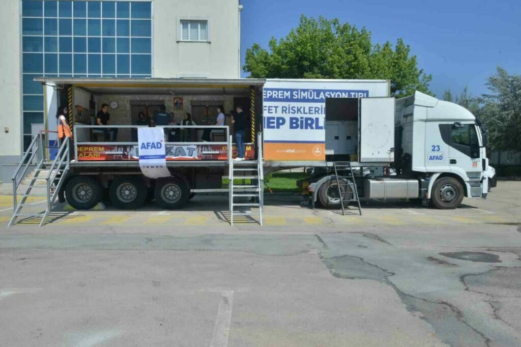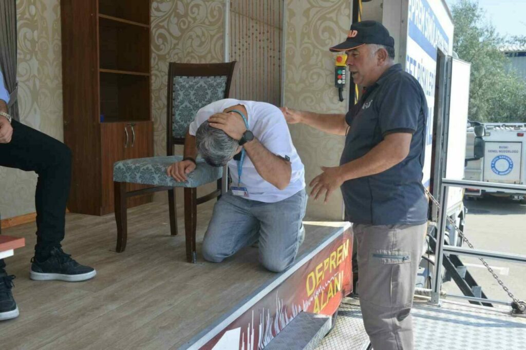 Bursa Büyükşehir Belediyesi BUSKİ Genel Müdürlüğü çalışanları, AFAD Başkanlığı tarafından deprem farkındalığı oluşturmak amacıyla oluşturulan simülasyon tırını ziyaret ederek hem 6.8 büyüklüğündeki depremi yaşadı hem de teorik konularda bilgilendirildi.