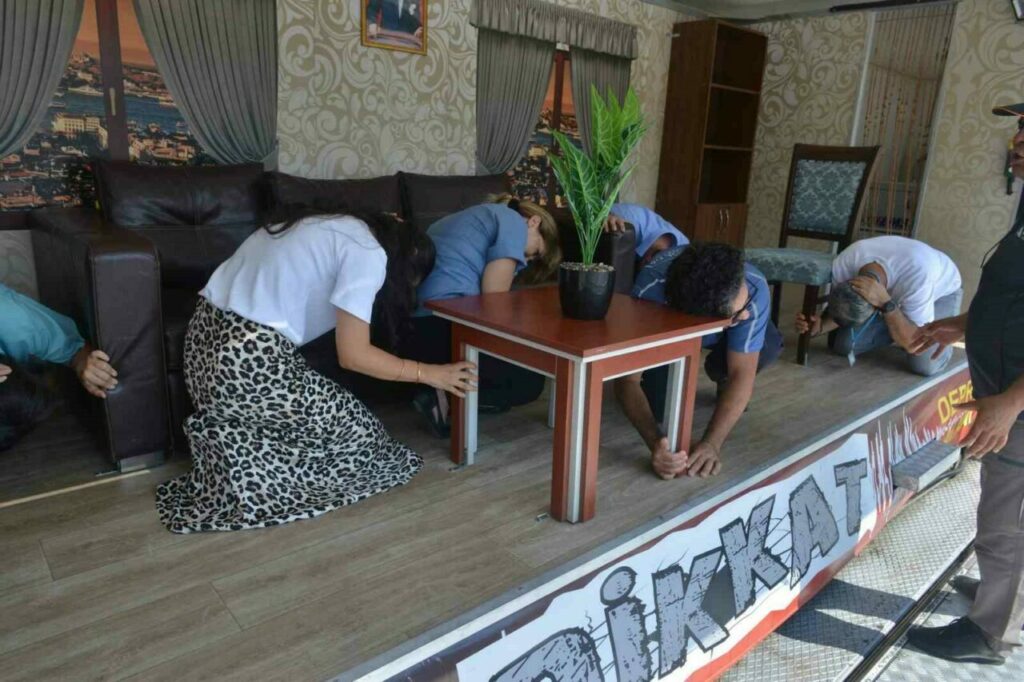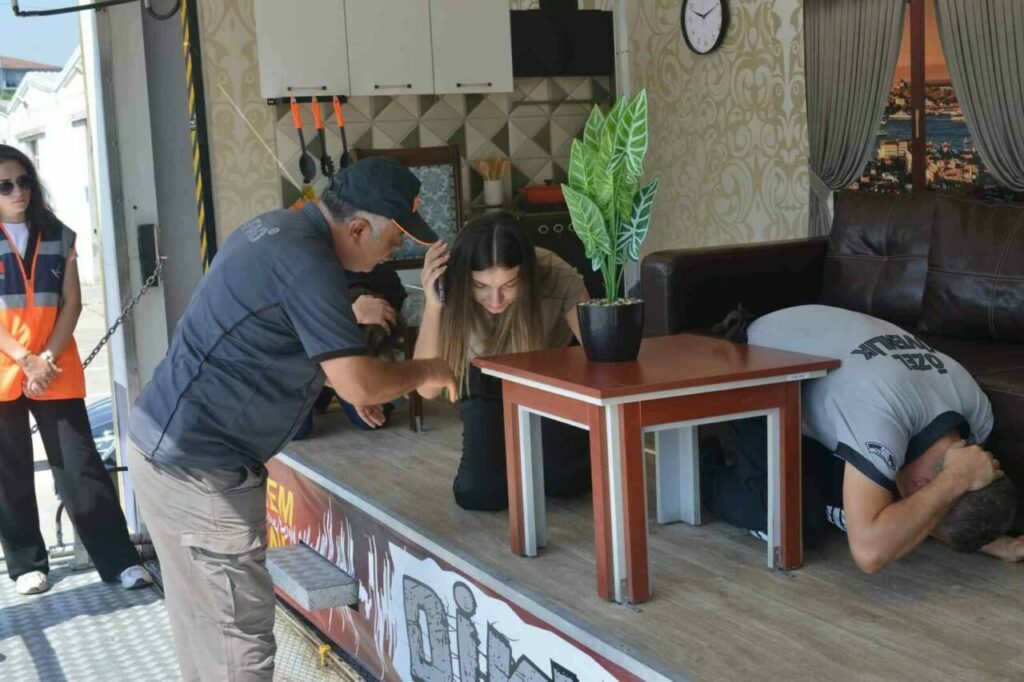 Birinci derece deprem kuşağında yer alan Bursa’yı muhtemel depremin yıkıcı etkilerine karşı daha dirençli hale getirmek için çalışmalarını sürdüren Büyükşehir Belediyesi, afet sırasında ve sonrasında yapılması gerekenler hakkında çalışanlara yönelik eğitim programları düzenlemeye de devam ediyor. Bu kapsamda AFAD Başkanlığı tarafından oluşturulan ‘Deprem Simülasyonu Tırı’, BUSKİ Acemler Yerleşkesi’ni ziyaret etti. Büyükşehir Belediyesi BUSKİ Genel Müdürlüğü İnsan Kaynakları Dairesi Başkanlığı Sivil Savunma Uzmanlığı koordinasyonunda düzenlenen programda, belediye çalışanları 6,8 ile 7,2 şiddetindeki yapay depremleri birebir yaşadı. Heyecanlı anlara sahne olan eğitimde, çalışanlar tarafından ‘çök-kapan-tutun’ yöntemi uygulandı. Programda uzman ekipler tarafından afetler karşısında doğru ve bilinçli hareket etmenin yolları teorik ve uygulamalı olarak gösterildi.