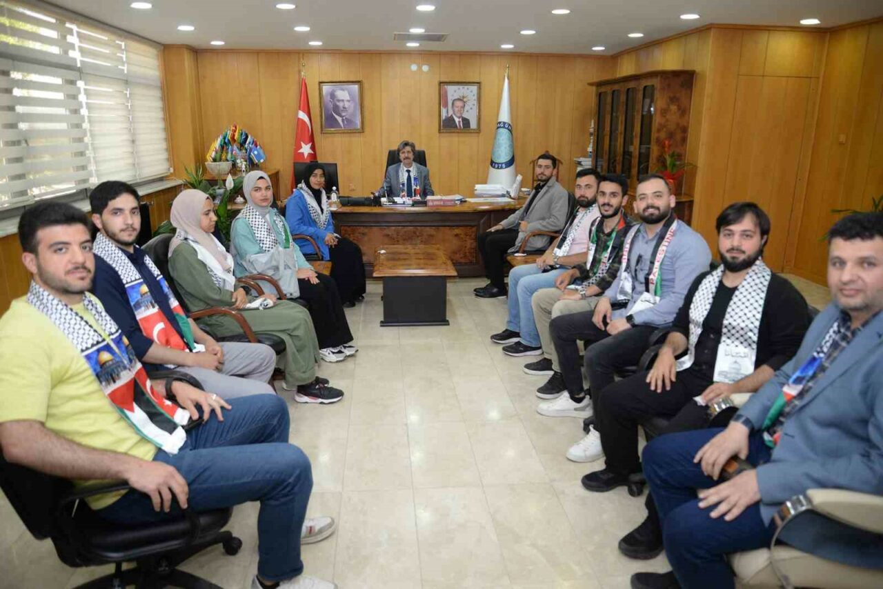 Öğrenciler, görüşme sonrasında Rektör Prof. Dr. Ferudun Yılmaz’a üzerinde Türk ve Filistin bayrakları olan atkı ile Mescid-i Aksa Camii maketi hediye etti.