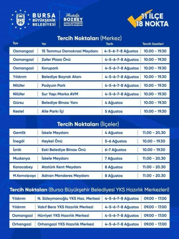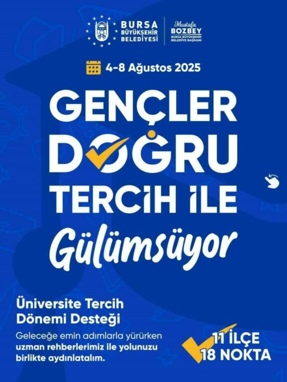Bursa’da eğitimden sanata, spordan kültüre kadar her alanda gençleri destekleyen Büyükşehir Belediyesi, üniversite sınavına girenlerin en doğru tercihi yapabilmesi için 11 ilçede oluşturulacak 18 farklı noktada ücretsiz danışmanlık desteği verecek.