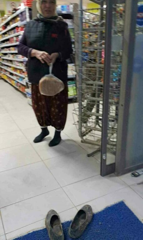 Bursa’nın İznik ilçesinde çiftçinin duyarlı hareketi alkış aldı. Zeytin toplamaya giden bir kadın çamurlu ayakkabılarını kapının önünde çıkarıp markete girdi.