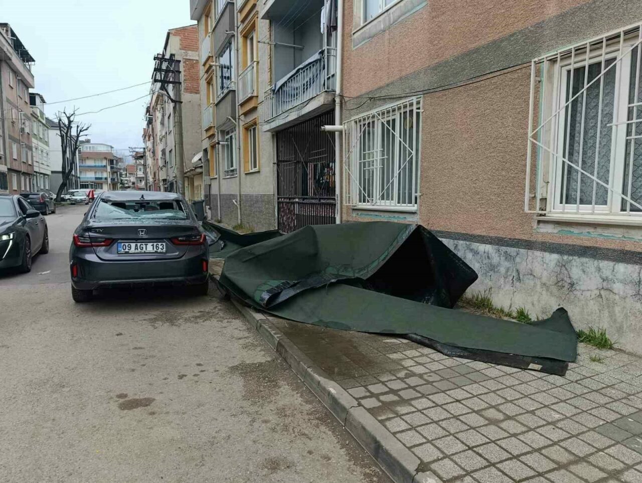 Bursa’nın İnegöl ilçesinde gece saatlerinde etkili olan lodos, bir apartmanın çatısındaki şıngılı yerinden sökerek park halindeki aracın üzerine savurdu. Olayda can kaybı yaşanmazken araçta maddi hasar meydana geldi.