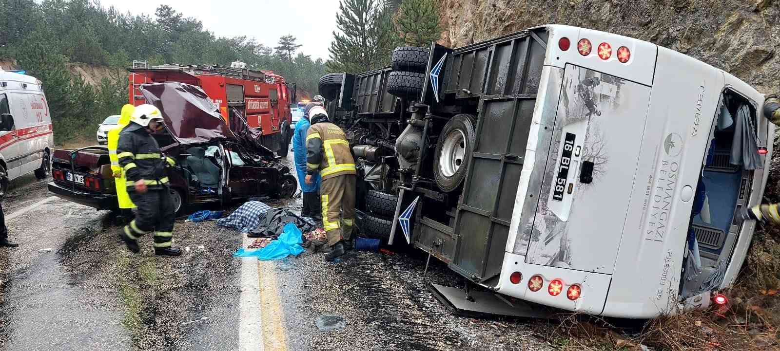 Olay, 18 Kasım 2023 öğle saatlerinde merkez Osmangazi ilçesi Güneybudaklar Mahallesi Bursa-Keles yolu üzerinde meydana geldi. Edinilen bilgiye göre, belediyeye ait 30 koltuklu 16 BL 581 plakalı midibüs, 11 yolcusuyla Keles ilçesi Baraklı Mahallesindeki cenazeye gitmek için yola çıktı. Midibüs sürücüsü N.Ö. (37), Keles istikametine ilerlerken 25. kilometrede sola virajda yağış sebebiyle direksiyon hakimiyetini kaybetti. Kontrolden çıkan midibüs, karşı istikametten gelen K.S. (28) idaresindeki otomobile çarptı. Çarpmanın etkisiyle gittiği istikametin tersine dönen midibüs, yan yattı.