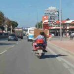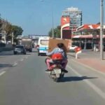 Bursa’nın Yıldırım ilçesinde anayola çıkan bir motosiklet sürücüsü arkasına aldığı kız çocuğuna eşya taşıttı. Kask takmadan kilometrelerce ilerleyen sürücü hem kendi, hem de arkasındaki küçük kız çocuğunu düşünmeden ilerlerken, tehlikeli yolculuk trafikteki vatandaşların kamerasına yansıdı.