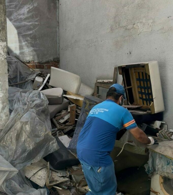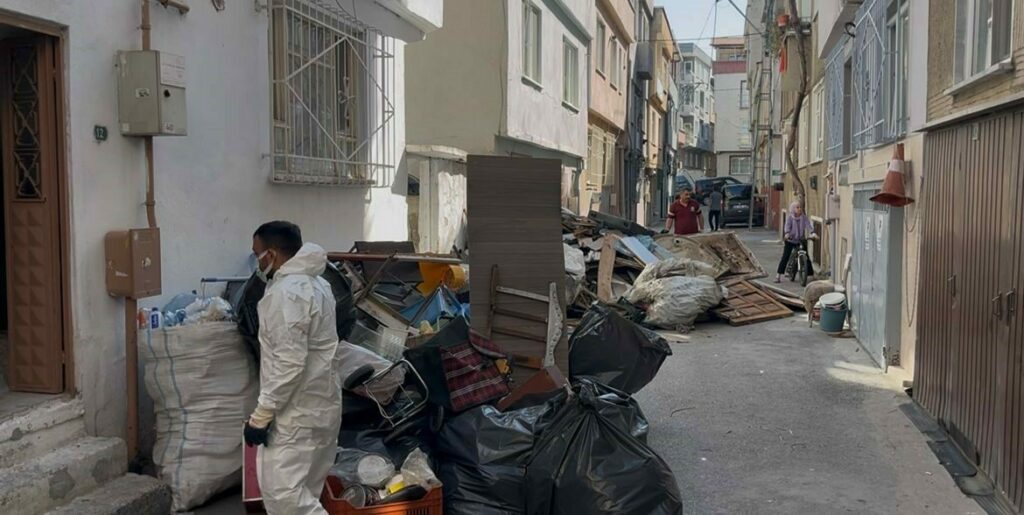 Bursa’nın Yıldırım ilçesi Yeşilyayla Mahallesi’nde ihbar üzerine olay yerine belediye ve polis ekipleri sevk edildi. Uzun süredir çevreye rahatsızlık veren kokuların kaynağı olduğu öğrenilen evde Yıldırım Belediyesi ekiplerince yapılan temizlik çalışmasında, kapıdan adım atacak yer kalmayacak şekilde yığılmış çöpler olduğu görüldü.