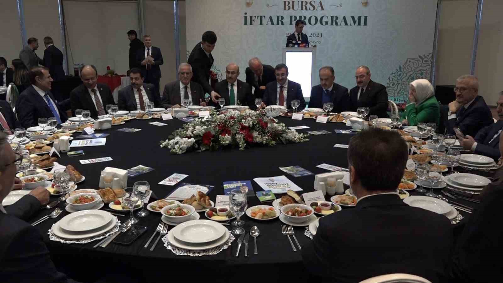 Cumhurbaşkanı Yardımcısı Cevdet Yılmaz, Bursa’da STK temsilcileri ve kanaat önderleri ile Merinos Atatürk Kongre ve Kültür Merkezi’nde düzenlenen iftar programında bir araya geldi. Programda konuşan Yılmaz, “AK Parti ve Cumhur İttifakı, milletin bağrından çıkmış siyasi hareketler ve gücümüzü biz milletten alıyoruz. Rotamızı da her zaman milletimiz çiziyor. Milletin önceliği neyse bizim önceliğimiz o. Milletin derdi neyse bizim derdimiz o. Böyle başladık böyle de devam ediyoruz. Dolayısıyla Ankara’da masa başında oturup, memleketi yöneten bir ekip hiçbir zaman olmadık. Türkiye’nin dört bir yanında bakanlarımız, yetkililerimiz, Sayın Cumhurbaşkanımız başta olmak üzere koşturuyoruz ve milletimizle bir arada ramazanın bereketinden, rahmetinden istifade etmeye çalışıyoruz” ifadelerini kullandı.