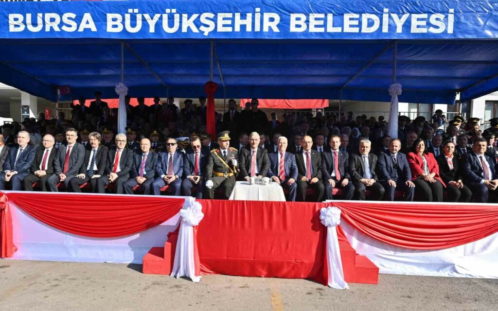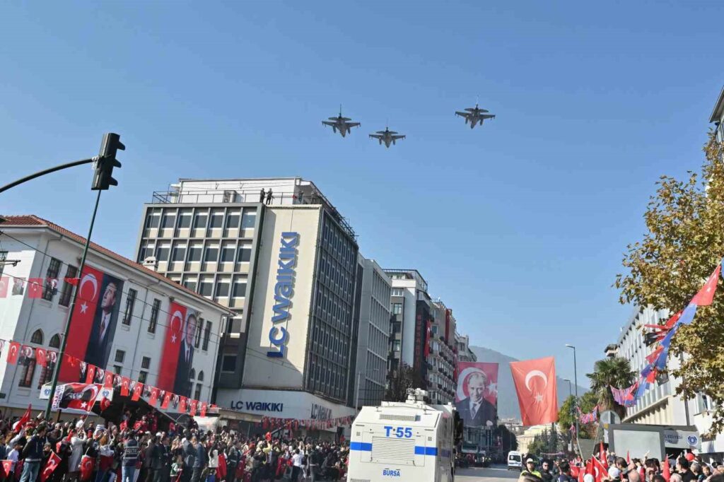 29 Ekim Cumhuriyet Bayramı’nın 101’inci yılı, Bursa Valiliği’nin düzenlediği programla kutlandı. Vatandaşlar, Atatürk Caddesi’ndeki törene büyük ilgi gösterdi. Törene, Bursa Valisi Erol Ayyıldız, Bursa Büyükşehir Belediye Başkanı Mustafa Bozbey, CHP Bursa İl Başkanı Nihat Yeşiltaş, Bursa Garnizon Komutanı Tuğgeneral Birol Arslan, Bursa Emniyet Müdürü Dr. Sabit Akın Zaimoğlu, İl Jandarma Komutanı Tuğgeneral İdris Tataroğlu, Bursa Milletvekilleri, siyasi parti temsilcileri de katıldı. Vali Erol Ayyıldız, Büyükşehir Belediye Başkanı Mustafa Bozbey ve Garnizon Komutanı Tuğgeneral Birol Arslan, askeri araçla halkı selamladı. İstiklal Marşı’nın okunarak Türk Bayrağı’nın göndere çekilmesinin ardından konuşan Vali Ayyıldız, vatandaşların Cumhuriyet Bayramı’nı kutladı. Program, tören geçişinin ardından tamamlandı.