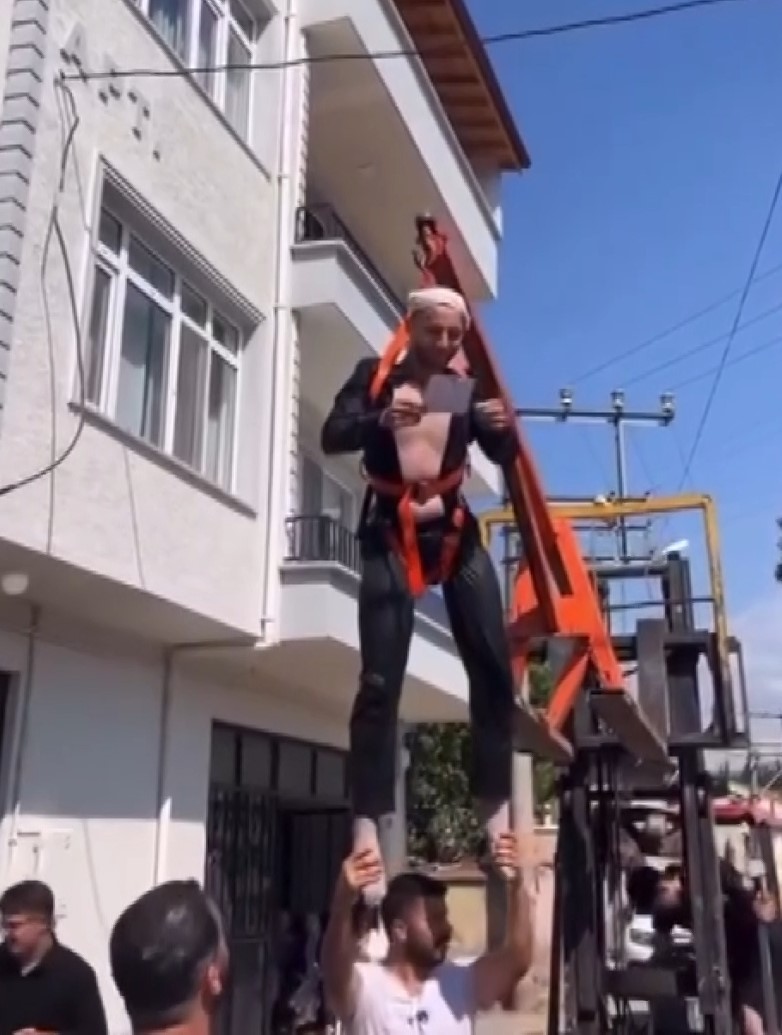 Bursa’nın İznik ilçesinde damada yapılanlar ’Bu kadar da olmaz’ dedirtti. Damadı önce forklifte astılar ardından bahçe hortumu ile yıkayıp su dolu bidona soktular. Sonra ise el arabasıyla sokak sokak gezdirdiler.