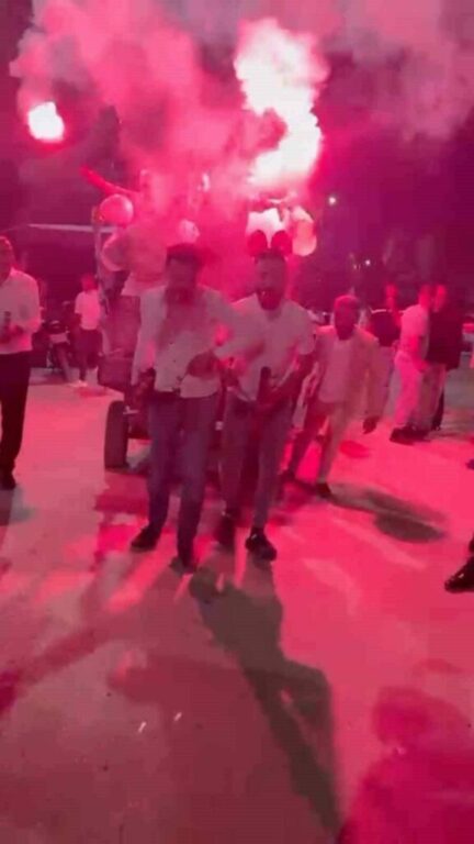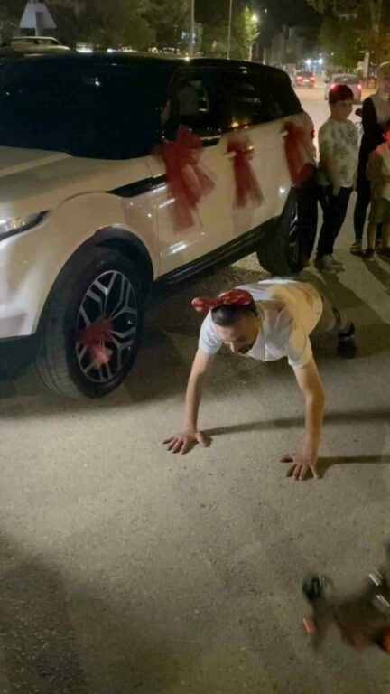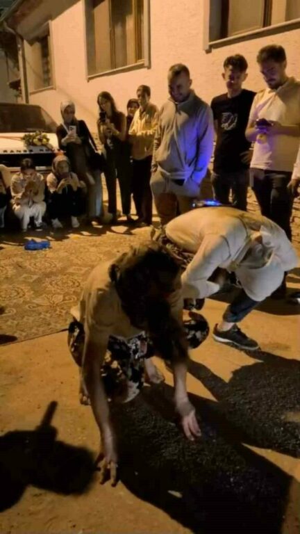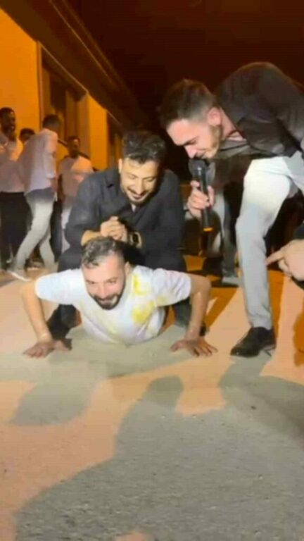 Eğlence sırasında damat ve sağdıç, arkadaşlarının zorlu isteklerini yerine getirmek zorunda kaldı. Damat 10 kez şınav çekip ördek yürüyüşü yaptı. Ardından 10 arkadaşının bindiği at arabasını 100 metre boyunca çeken damat ve sağdıç, yaklaşık 500 kilogram kumu da elleriyle römorka yükledi.