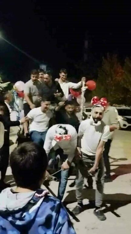Eziyet bununla da sınırlı kalmadı. Damat ve sağdıç kadın elbiseleri giyerek şişe oyunu oynadı. Renkli anlar, katılımcıların cep telefonu kameralarıyla kaydedildi.