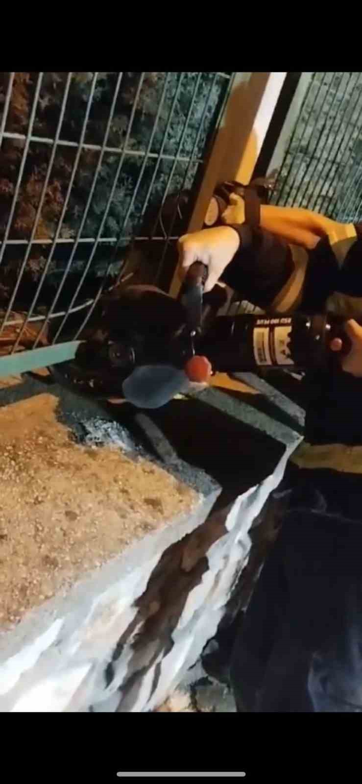 Bölgeye sevk edilen itfaiye ekibi, demir korkuluklara sıkışan köpeği kurtarmak için dakikalarca ter döktü. Demir korkulukları keserek köpek sıkıştığı yerden kurtaran ekiplerin mücadelesi kameraya anbean yansıdı. Çığlık atarak kurtulan yavru köpek daha sonra yaşam alanına bırakıldı.