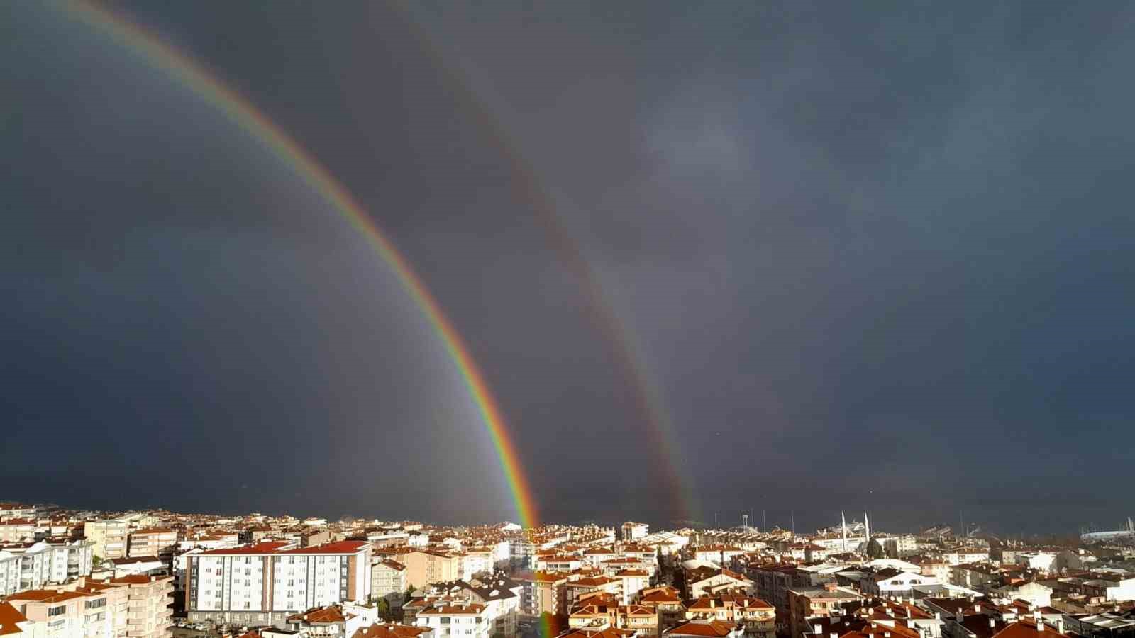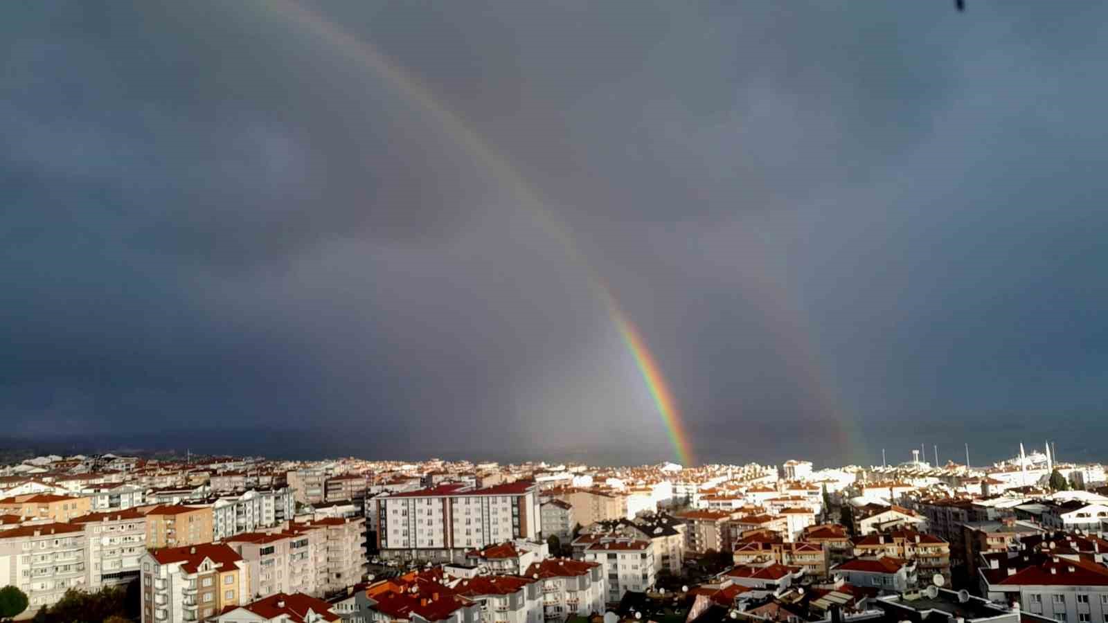 Bursa’nın Mudanya ilçesinde geceden beri etkili olan yağış sabah saatlerinde de devam etti. Bir ara yağmurunu dinmesiyle birlikte bulutların arasından kendini gösteren güneşle birlikte gökkuşağı oluştu. Denizin ortasında beliren gökkuşağının kartpostallık görüntüsü amatör fotoğrafçı Yeliz Portakal tarafından cep telefonu ile kaydedildi. Bulutların güneşi kapatmasıyla gökkuşağı kısa bir süre sonra kayboldu.