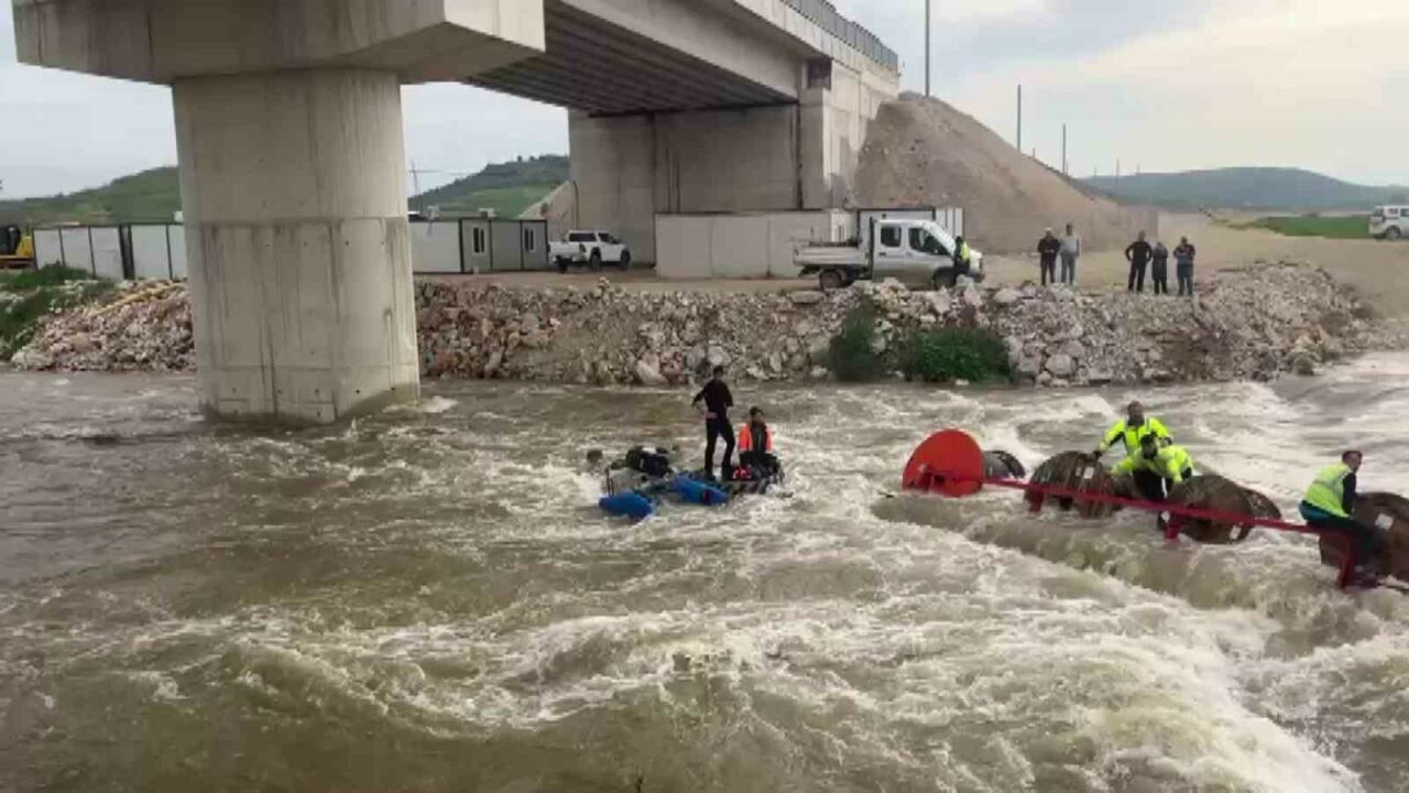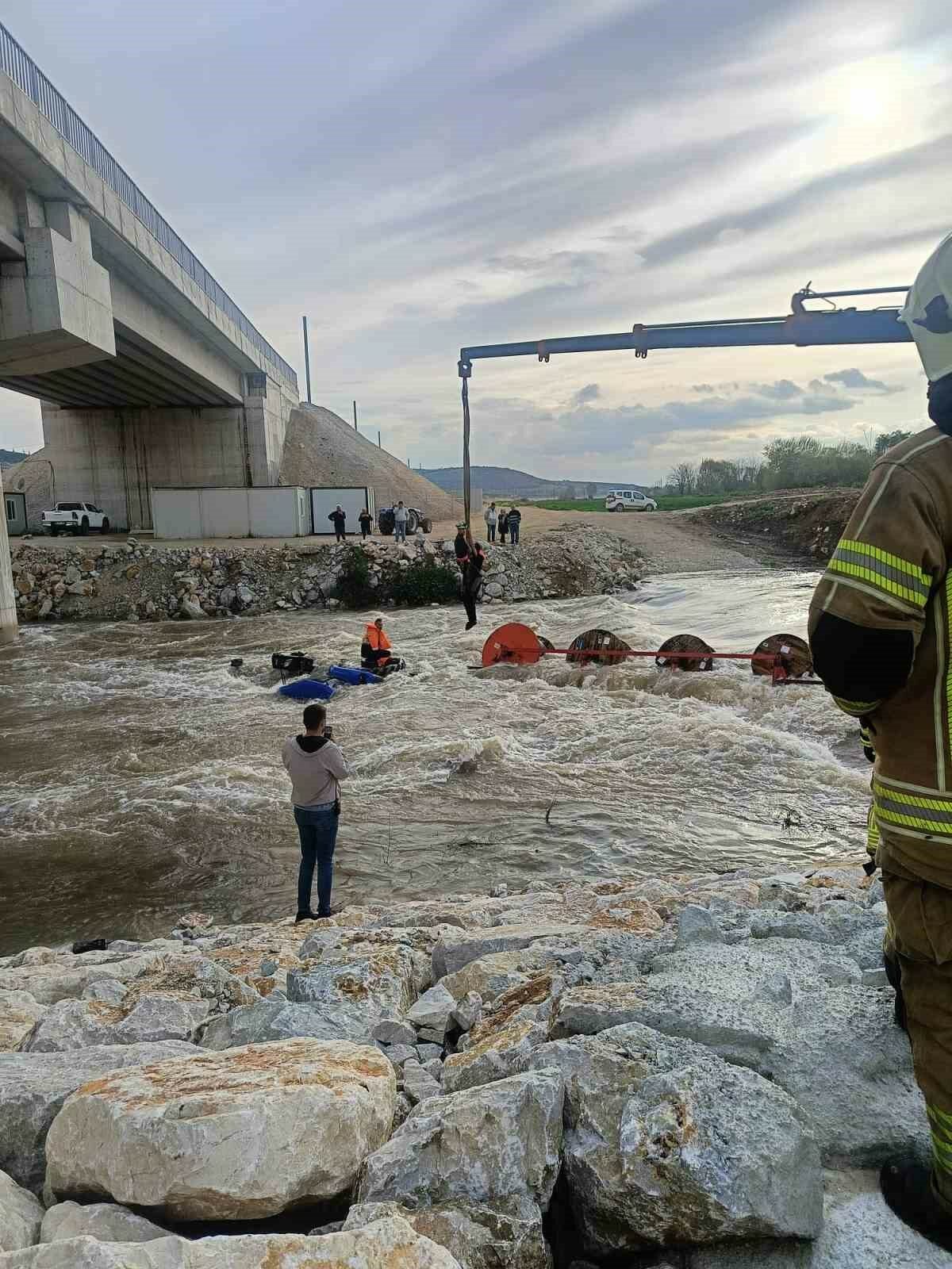 Bursa’nın Yenişehir ilçesinde Kocasu Deresi’nden traktörle karşıya geçmek isteyen 10 işçinin bulunduğu traktör, suyun ortasında devrildi. Akıntının etkisiyle dengesini kaybeden traktördeki işçiler dere içinde mahsur kaldı.