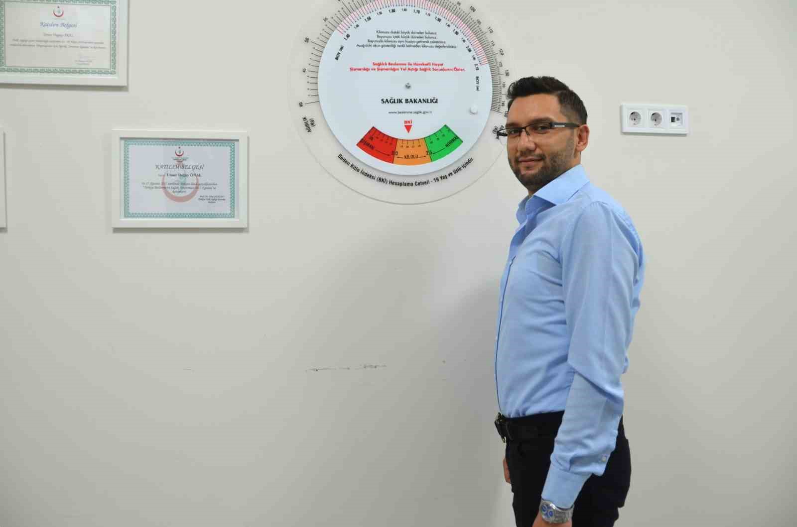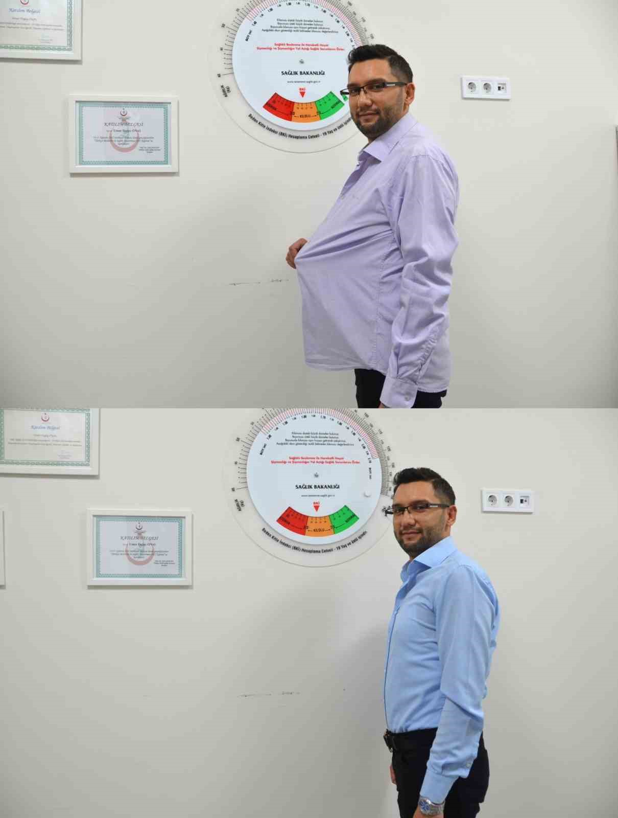 DÜZENLİ DİYET PROGRAMI İLE 6 AYDA 92 KİLODAN 69 KİLOYA DÜŞEREK TOPLAMDA 23 KİLO VERDİĞİNİ SÖYLEYEN NİLÜFER İLÇE SAĞLIK MÜDÜRLÜĞÜ’NDE GÖREVLİ DİYETİSYEN UMUR DOĞAY ÖNAL, KİLO VERMEK İSTEYEN DANIŞANLARINA KENDİNİ ÖRNEK GÖSTERİYOR. DANIŞANLARINA SOMUT ÖRNEK OLDUĞUNU İFADE EDEN ÖNAL, KİLO VERME SÜRECİNDE ONLARIN DA MOTİVASYONLARINI ARTTIRDIĞINI BELİRTTİ.