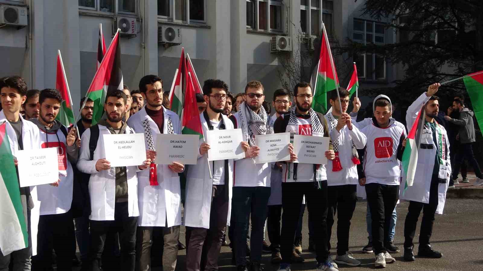 Uludağ Üniversitesi öğrencisi İsmail Can yaptığı konuşmada, “Bugün, burada, bütün dünya liderleri tarafından kaderine terk edilmiş bir şehrin acısını paylaşmak için toplandık. Bombalanan ameliyathanelerini terk etmeyen, kendi çocuklarının ölü bedenleriyle vedalaştıktan sonra belki bir can daha yaşatabilirim derdiyle hastalarına koşan, malzemeleri kalmadığı halde en ilkel şartlarda olsa bile sağlık hizmetlerini sürdüren Gazze’li meslektaşlarımızı selamlamak için toplandık. İşgalci İsrail devletinin 1948’den beri sürdürdüğü katliam ve soykırım 7 Ekim’den bu yana insanlığın görmediği bir seviyeye ulaşmıştır. Bu saldırılarda şehit düşen binlerce kardeşimize, meslektaşımıza Allah’tan rahmet yaralılara acil şifalar diliyoruz. Hepimiz bir sınavdan geçiyoruz. Gazze, bugün, her birimiz için bir insanlık sınavıdır. Nice savaşlar görmüş geçirmiş olan şu yeryüzü, bunca insanın gözü önünde, böyle bir vahşeti, katliamı, soykırımı kaç defa seyretmiştir acaba. Evet, bugün, bütün dünyanın gözü önünde, binlerce çocuk, binlerce kadın, binlerce masum katlediliyor. Gazze’de, insanlık, Gazze’de merhamet, Gazze’de vicdan, Gazze’de hayat neşesi, Gazze’de çocuk tebessümleri haftalardır katil İsrail tarafından tekrar tekrar öldürülüyor. Okullar bombalandı, mülteci kampları bombalandı, ibadethaneler bombalandı. Çocukların su doldurmak için bidonlarıyla sıra bekledikleri su tankerleri bombalandı. Her birinde bir umuttu ambulanslar, doktorlar ve hastaneler. Ama artık o umudu da katlediyor İsrail. Artık hastaneler bombalanıyor. Anne babasını kaybetmiş yaralı çocukların kucaklarda getirildiği, enkazdan çıkartılmış kolu-bacağı kopmuş ihtiyarların, korkudan titreyen yüzü gözü toza bulanmış bebeklerin sedyelerinde tedavi için beklediği hastaneleri bombalıyor gözü dönmüş İsrail. Gazze yalnız bırakıldı. Bütün dünyada, ülke liderleri, halklarının isyanına, Gazze’ye verdikleri desteğe rağmen batının şımarık çocuğu gibi davranmaya devam eden İsrail’e karşı sessiz kalmayı tercih ediyor. Biz hekimler olarak, bu siyaseti ayaklarımızın altına alıyoruz ve bütün vicdanlı dünya doktorları gibi Gazze halkının yanında olduğumuzu haykırıyoruz” dedi.