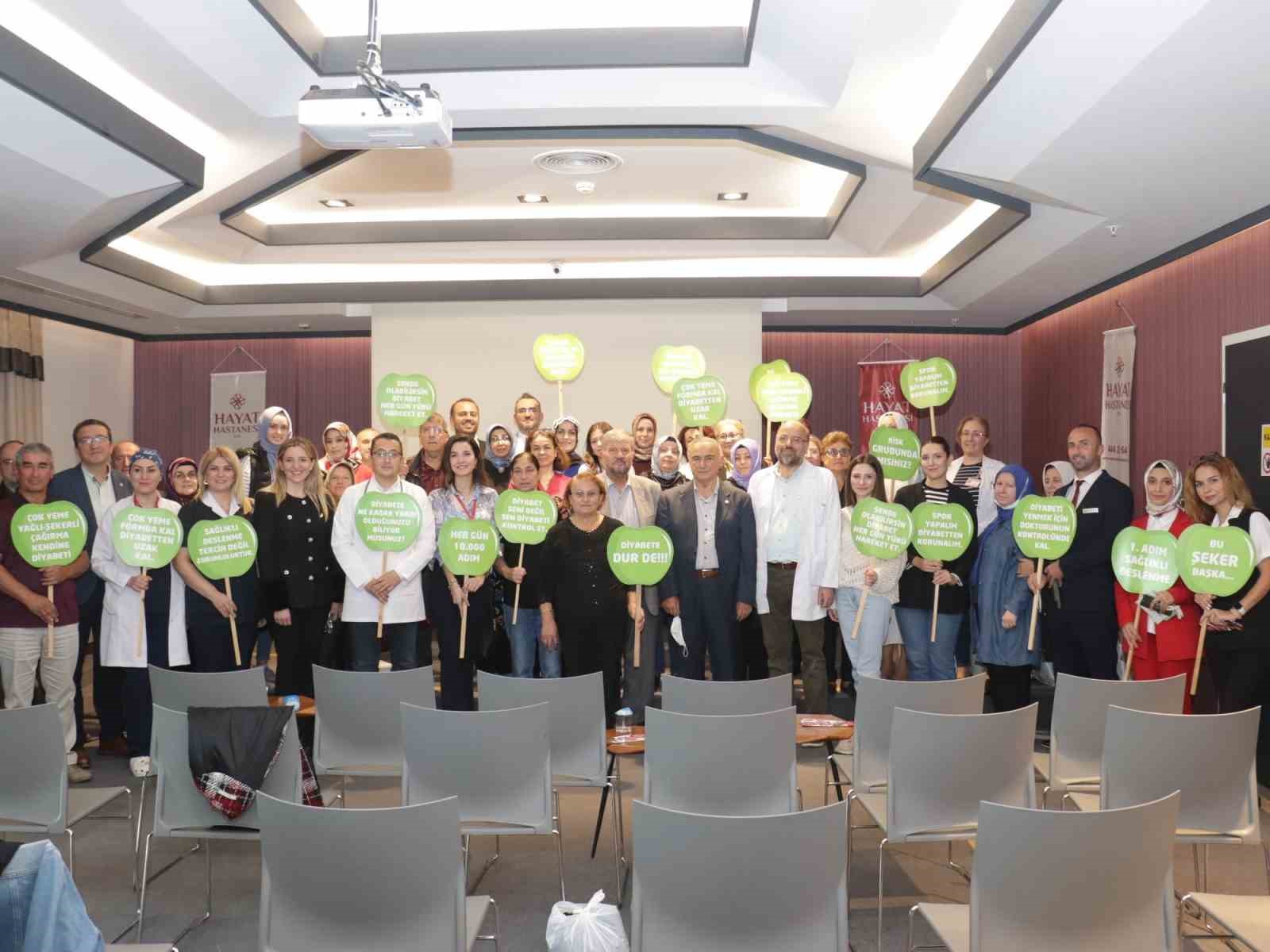 Dünya Diyabet Günü etkinlikleri çerçevesinde diyabete dikkat çekmek ve farkındalık oluşturmak için bir dizi etkinliğe imza atan hastane, düzenlediği seminerle şeker hastalığının sağlığa olan etkilerine vurgu yaptı. Hastanenin toplantı salonunda organize edilen seminere; Hayat Hastanesi Başhekimi Dr. Fatih Özkul, Yönetim Kurulu Başkan Yardımcısı Betül Kabalar, Yönetim Kurulu Üyesi İbrahim Özkul, Dahiliye Uzmanları Dr. Ali Nizamoğlu, Dr.Muhittin Pekuz, Dr. Mehmet Erdoğmuş, Diyetisyen Fatma Hallaç Uslu ve çok sayıda vatandaş katıldı.