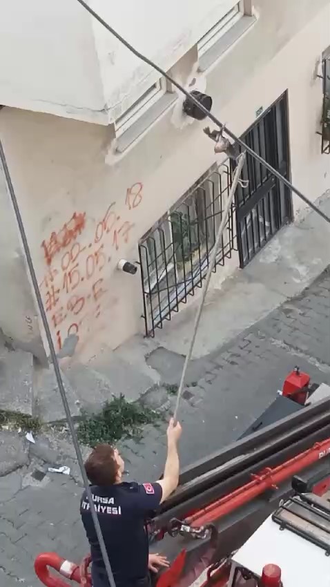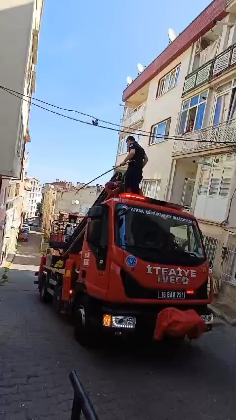 Bursa’da sokakta bulunan elektrik kablosuna ayakları dolanan kuş, itfaiye ekipleri tarafından kurtarıldı.