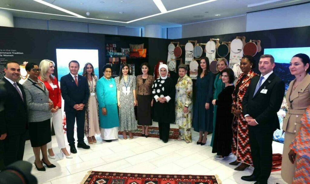 Emine Erdoğan ve beraberindeki lider eşleri, program kapsamında ilk olarak, Sanayi ve Teknoloji Bakanlığı’nın öncülüğünde hazırlanan ve Anadolu`nun binlerce yıllık bilgi, zanaat ve kültür birikimini bugünün tasarım anlayışıyla buluşturan sergiyi gezdi. Sergide, Anadolu’nun köklü kültürünü, ustalığını ve doğayla uyumlu üretim geleneklerini tasarım ve yenilikle buluşturan eşsiz eserler yer aldı. Bu özel koleksiyonun dikkat çeken parçaları arasında Bursa’nın dünyaca ünlü ipeği de öne çıktı.