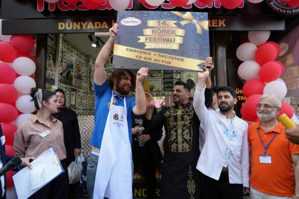 İstanbul’un ardından 14’üncüsü Bursa’da düzenlenen Geleneksel Börek Yeme Yarışması’nda yarışmacılar 5 dakikada 16 metre börek yemek için mücadele etti. İlk 3’e giren 3 yarışmacıda aynı metrede börek yeme başarısını gösterince ’VAR’a gidildi. Hassas terazi ile tartılan böreklerde birinciyi 40 gramlık fark belirledi. 11 metre börek yiyen Ali Kılıç geriye 584 gram en az böreği bırakarak yarışmanın birincisi oldu. Aynı metre börek yiyen bayan yarışmacı Fatma Arslan geriye 624 gram börek bırakarak 2., Uğur Dündar ise bıraktığı 700 gram börekle 3. oldu. Birinci 10 gram altının sahibi oldu.