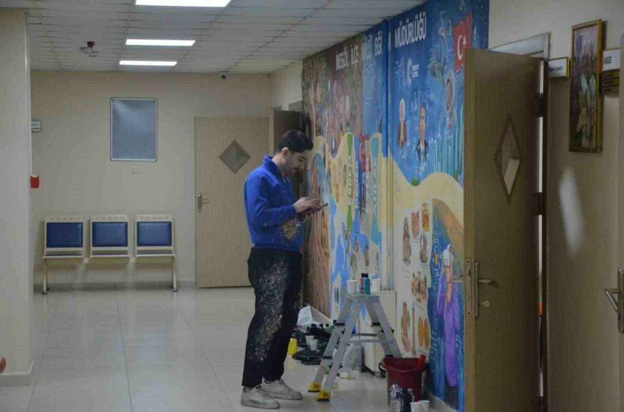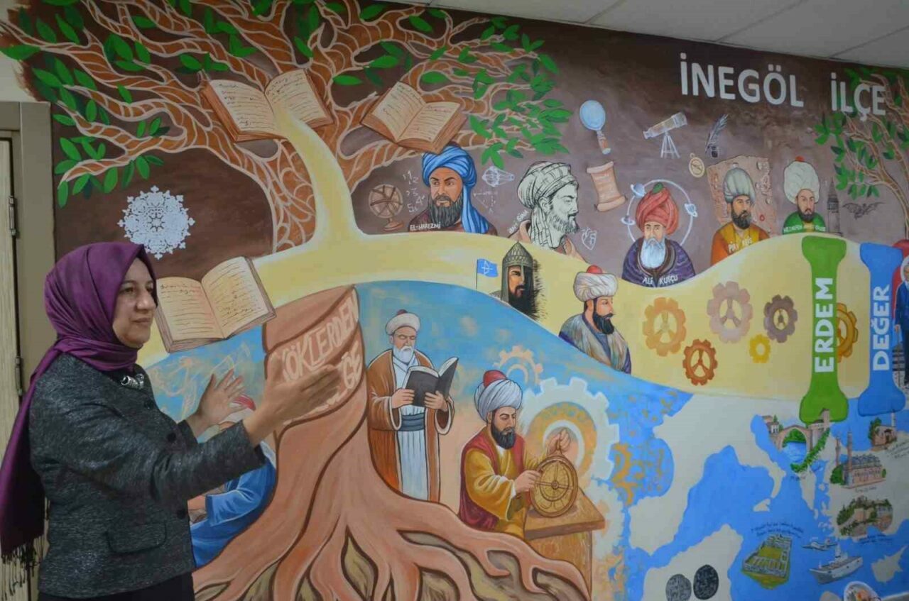 Bursa’nın İnegöl ilçesinde engelli bir öğretmen, Türkiye Yüzyılı Maarif Modeli müfredatını hayal gücü ile İnegöl Milli Eğitim Müdürlüğü’nün duvarına resmetti.