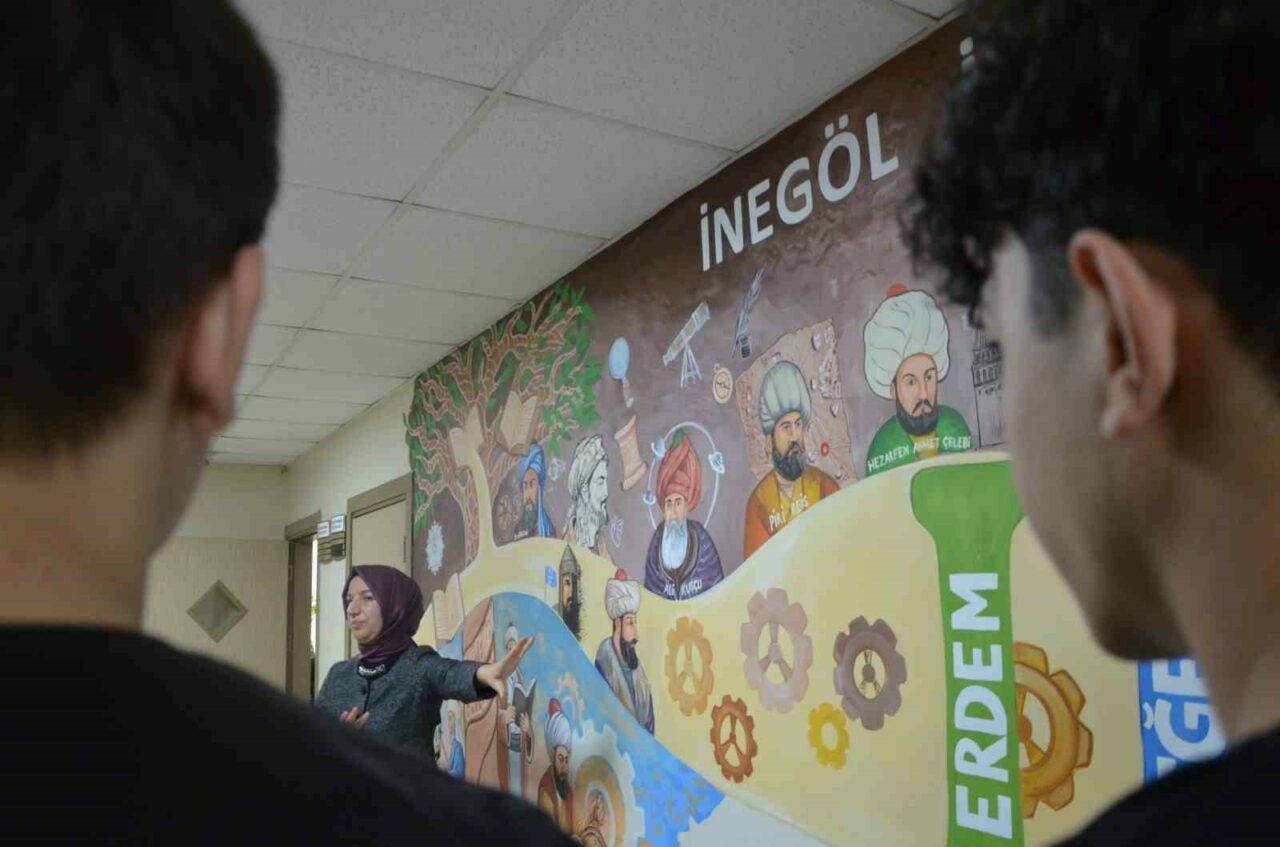 İnegöl Turgutalp Lisesi’nde eğitim gören 10’uncu sınıf öğrencilerine tarih öğretmeni resim üzerinden ders anlattı. Resim çalışmasının 4 ay sürdüğünü belirten Muhammet Nurbiçen(30), “Bu çalışmalar öğrencilerin tarihi ve kültürel anlamda gelişimine katkı sunuyor” ifadelerini kullandı.