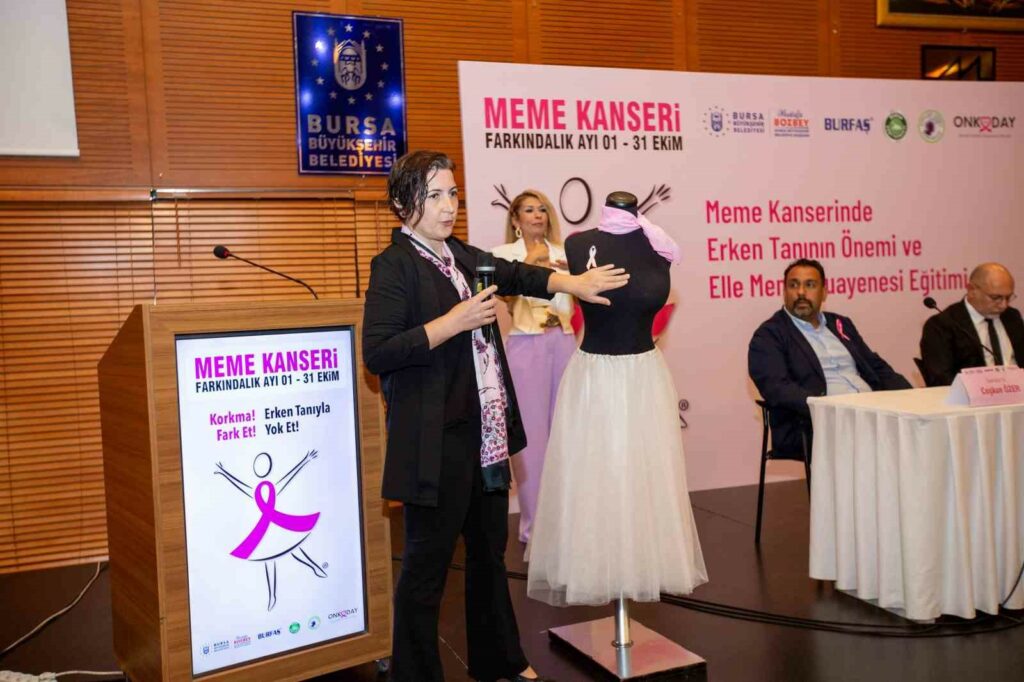 Bursa Büyükşehir Belediyesi, Bursa Kent Konseyi Kadın Meclisi, BURFAŞ ve Onkoday (Uludağ Onkoloji Dayanışma Derneği) iş birliğiyle Merinos AKKM – Hüdavendigar Salonu’nda gerçekleştirilen etkinlikte meme kanseri farkındalığını artırmak amacıyla uzman doktorlar tarafından eğitim verildi. Etkinlikte katılımcılara, meme kanserinin erken teşhisi için kendi kendine meme muayenesinin nasıl yapılacağı da anlatıldı.