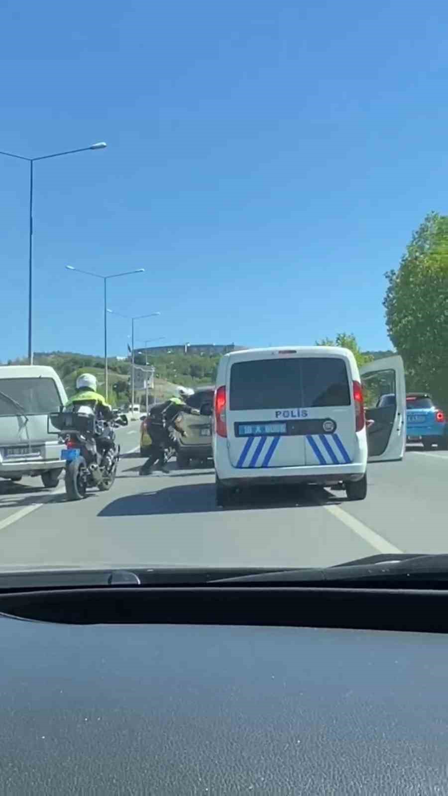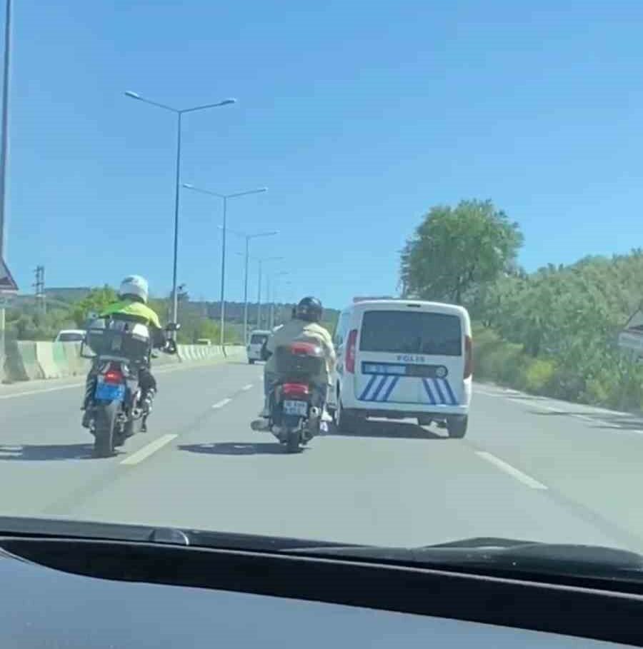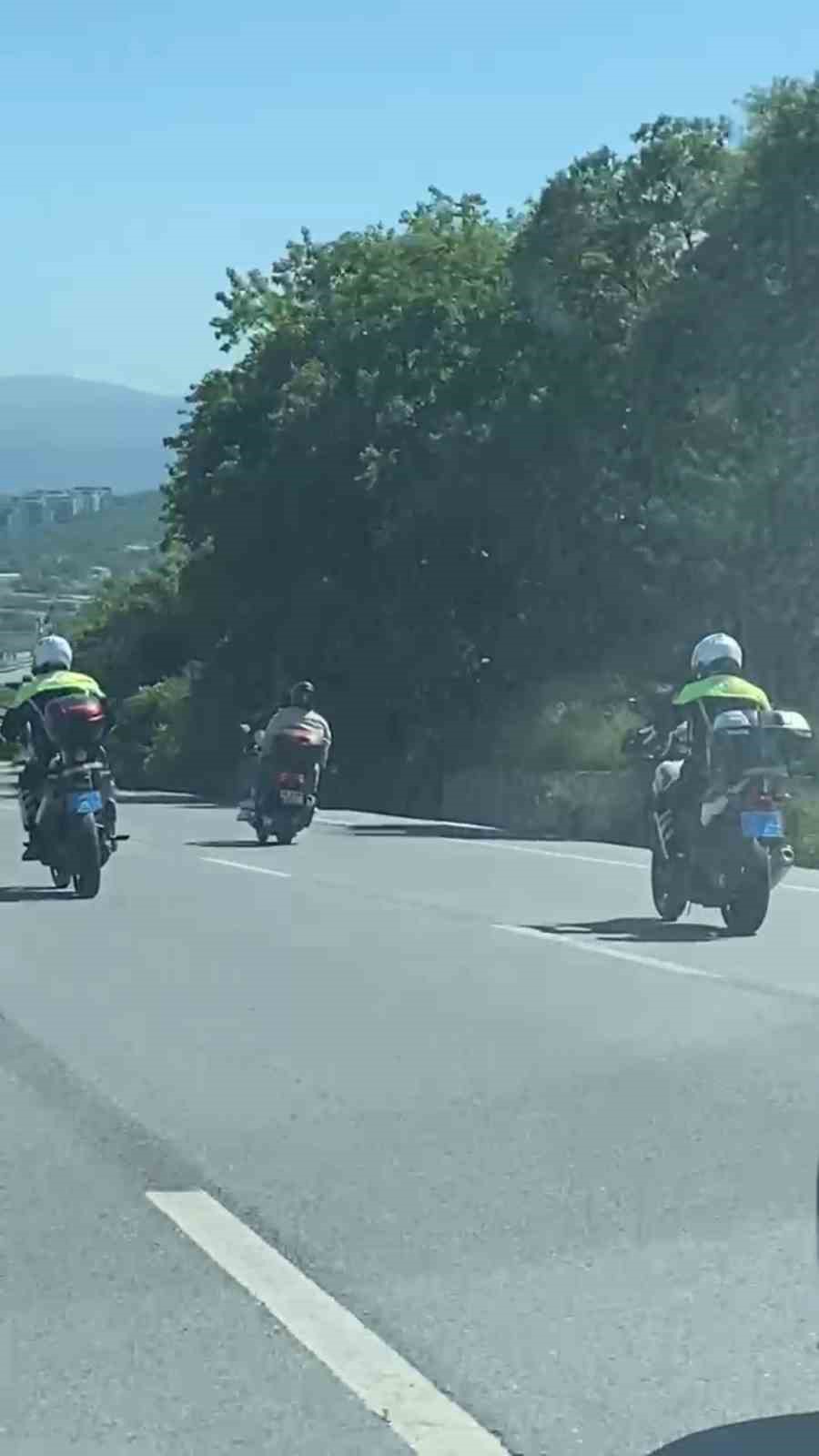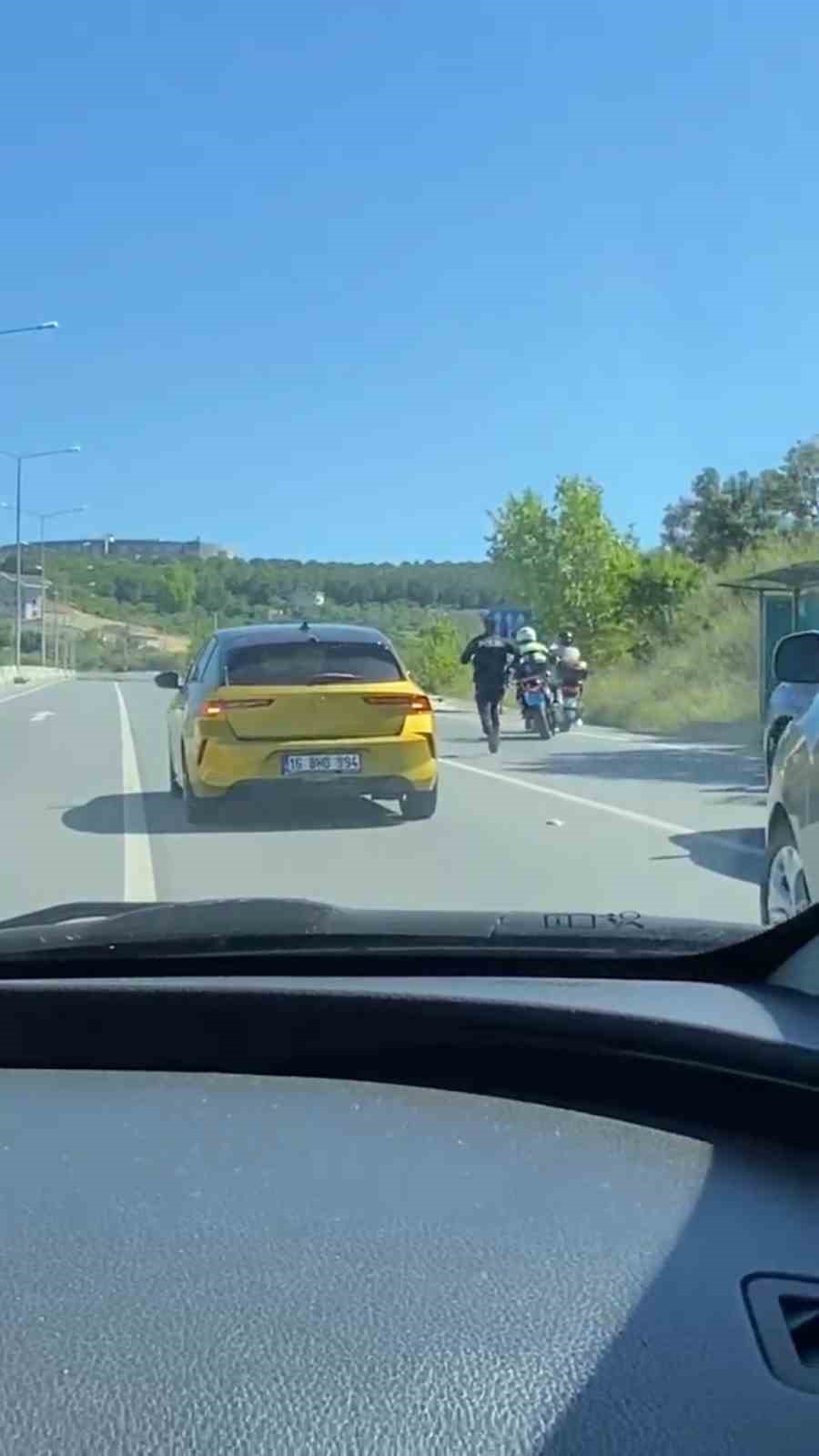 Bir süre sonra kaçan sürücünün peşine Trafik Denetleme Büro Amirliği’ne bağlı motosikletli polis ekipleri de takıldı. Mudanya-Bursa Yolu’nda ekiplerden kaçmaya çalışan motosiklet sürücüsü, trafiği birbirine kattı. Film sahnelerini aratmayan anlar, saniye saniye amatör kameraya yansırken, sürücü trafiğin yoğun olduğu yerde kamera açısından kayboldu.