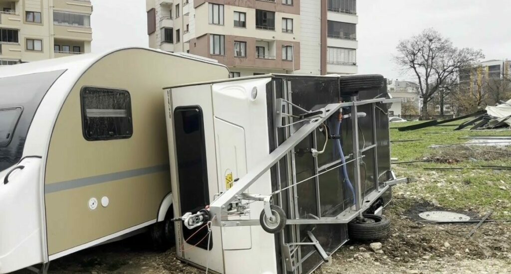 Bursa’nın Osmangazi ilçesinde 3 katlı bir binanın çatısı fırtınada havalanıp sokağa düştü. Olayda şans eseri yaralanan olmadı. Nilüfer ilçesindeki lüks bir galeri önündeki karavan ve motorlar da fırtınada devrilip zarar gördü. Galerinin kepenkleri ise şiddetli rüzgarda uçtu.