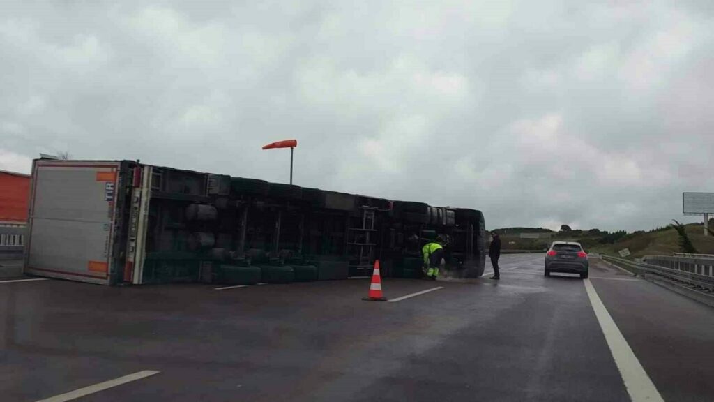 Bursa İstanbul otobanı Orhangazi Gebze arasındaki bir viyadükte tır fırtınanın etkisiyle devrildi. Diğer sürücüler de panik yaptılar. Aracın sürücüsü direksiyondan hafif yaralı olarak kurtuldu.