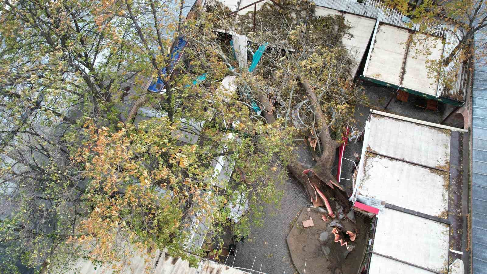 Bursa’da saatteki hızı 100 kilometreye ulaşan şiddetli fırtına tarihi Kozahan’daki 250 yıllık çınar ağacını kökünden söktü. Olayın gece yaşanması muhtemel faciayı önlerken, kafeteryalar da çınarın kırılan devasa dallarıyla zarar gördü. Devrilen çınarın görüntüsü dron ile görüntülendi.